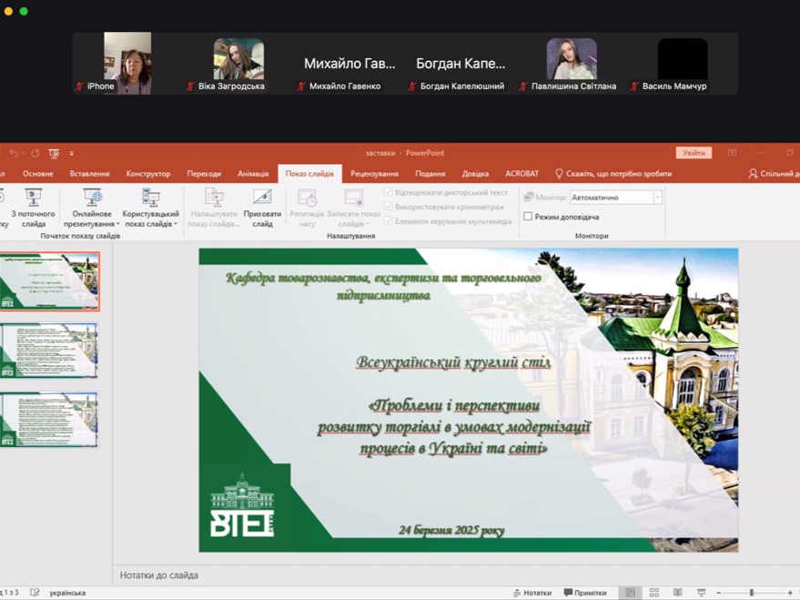 24 березня 2025 року кафедрою товарознавства, експертизи та торговельного підприємництва у змішаному форматі проведено Всеукраїнський круглий стіл на тему «Проблеми і перспективи розвитку торгівлі в умовах модернізації процесів в Україні та світі».