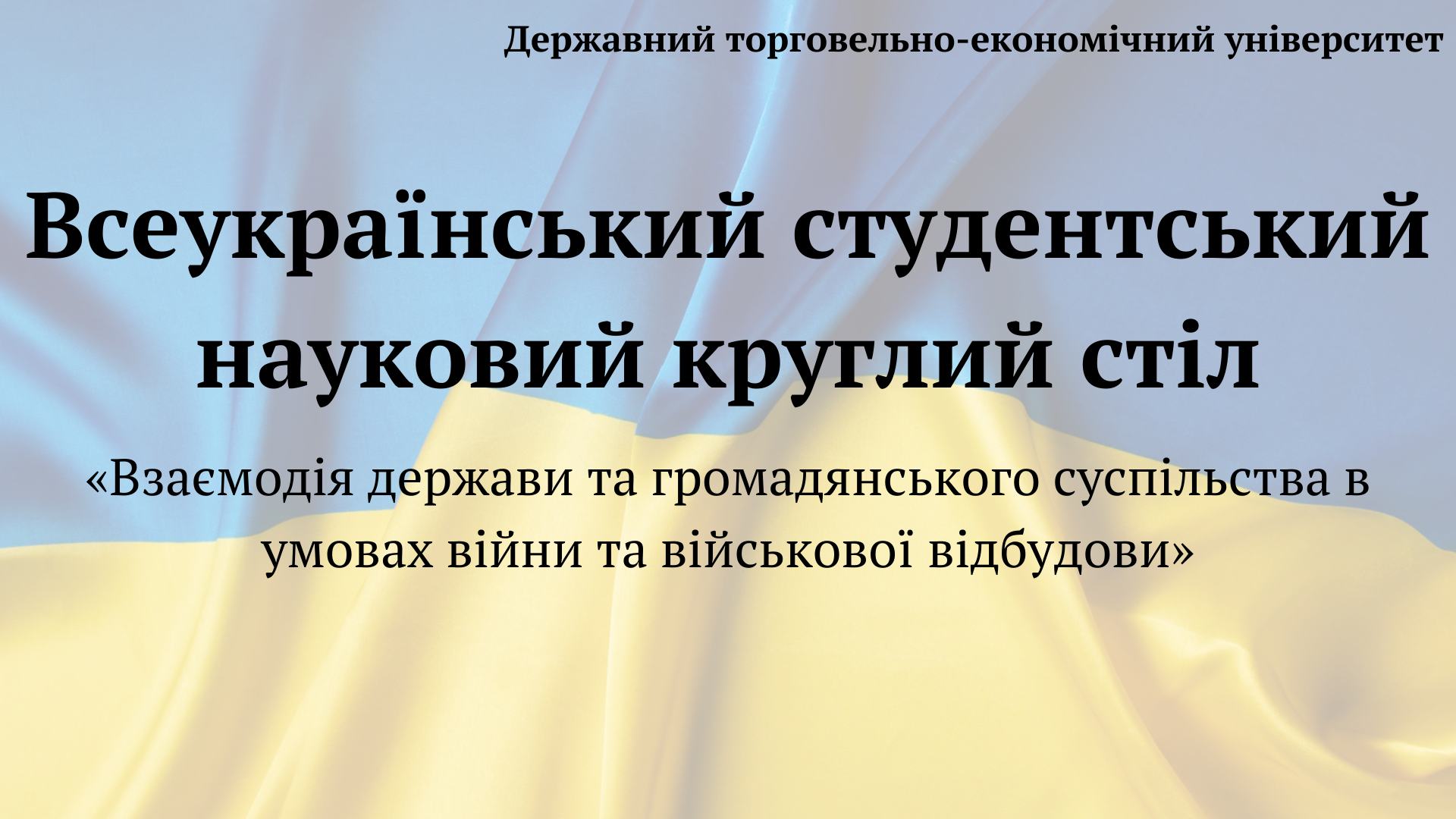 26 березня 2025 року з ініціативи кафедри публічного управління та адміністрування Державного торговельно-економічного університету відбувся Всеукраїнський студентський науковий круглий стіл на тему «Взаємодія держави та громадянського суспільства в умовах війни та військової відбудови». До заходу доєднались здобувачі спеціальності 281 «Публічне управління та адміністрування» Вінницького торговельно-економічного інституту ДТЕУ.