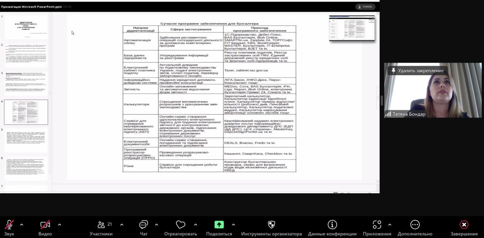 8 травня 2025 року на базі кафедри обліку та оподаткування проведено лекцію on-line кандидатом економічних наук, доцентом, головним бухгалтером ПП «Довіра» Бондар Тетяною на тему: «Діджиталізація бухгалтерського обліку».