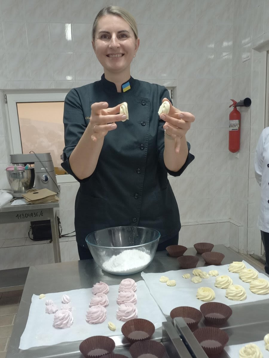 Здобувачі вищої освіти мали можливість власноруч приготувати зефір із використанням натуральних фруктових пюре та желюючих агентів, дотримуючись технологічного процесу та вимог санітарії. Особливу увагу приділено питанням впровадження у виробництво кондитерських виробів інновацій, зокрема використанню натуральних барвників і підсолоджувачів.