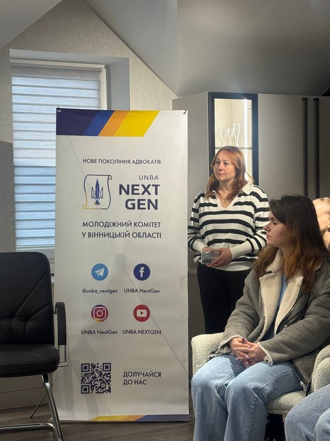 Партнерка центру, адвокатка Юлія Олійник, поділилася своїм шляхом у юридичній професії та розповіла про діяльність Молодіжного комітету Національної асоціації адвокатів України – UNBA NextGen, запросивши студентів долучатися до спільноти молодих юристів.