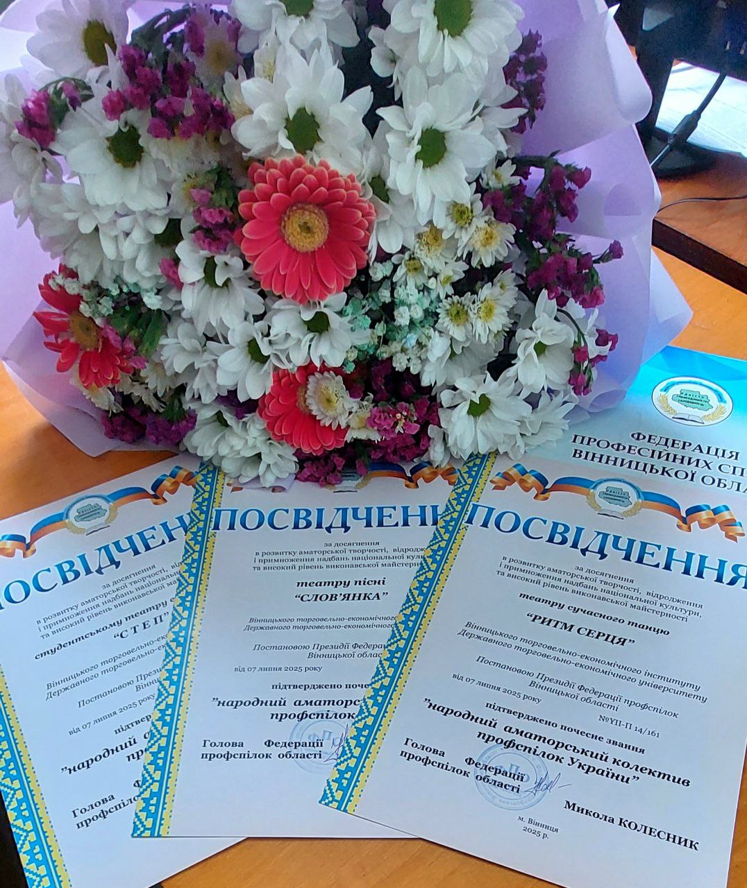 Де за поданням обласної організації профспілки працівників торгівлі, було занесено на Дошку Пошани Федерації профспілок області директора ВТЕІ ДТЕУ Наталію Замкову. Начальнику відділу з організації виховної та культурно-мистецької роботи студентів інституту Вікторії Гнатюк вручили три Посвідчення ФПО про підтвердження почесного звання «Народний аматорський колектив профспілок України, а саме: народному театру пісні «Слов’янка», художній керівник Заслужений артист України Адам Дзюба; народному студентському театру естрадної пісні «СТЕП», художній керівник Вікторія Гнатюк та народному театру сучасного танцю «Ритм серця», художній керівник Яна Мельник.