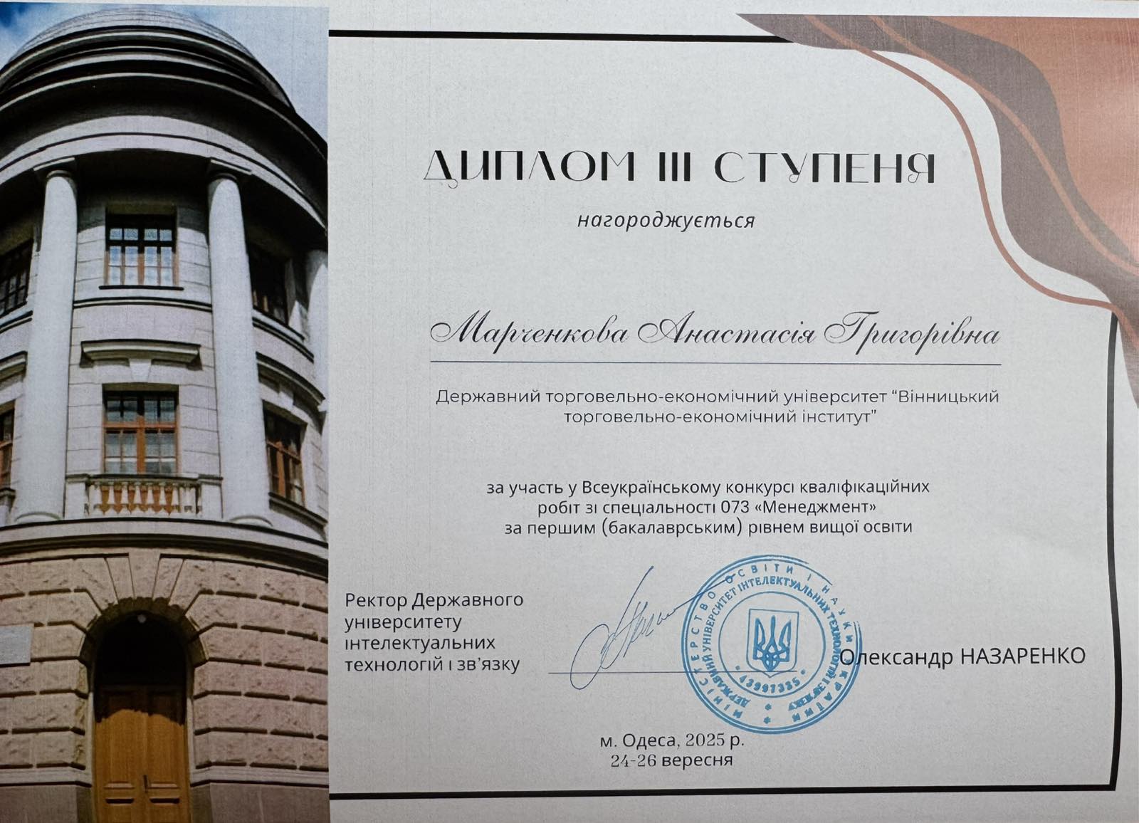 Перемога у Всеукраїнському конкурсі кваліфікаційних робіт зі спеціальності 073 «Менеджмент» за першим (бакалаврським) рівнем вищої освіти