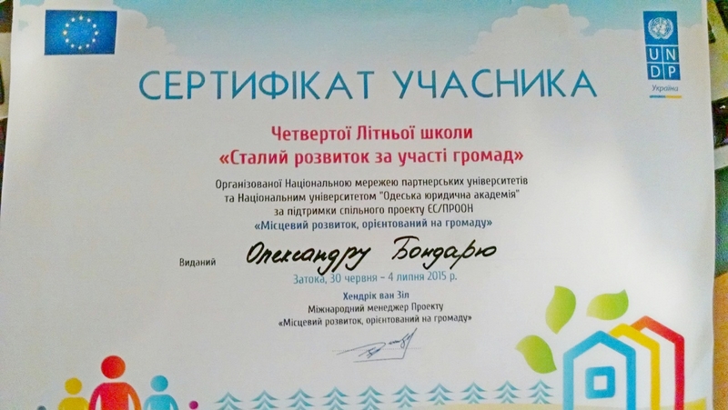За результатами IV Всеукраїнського конкурсу студентських наукових робіт з тематичного напряму «Сталий розвиток за участі місцевих громад» здобувачі ВТЕІ КНТЕУ отримали дві нагороди: - Бондар Олександр, здобувач освітнього рівня «Магістр» спеціальності «Менеджмент організацій» отримав запрошення та відвідав Літню школу зі сталого розвитку (30.06.2015р.-04.07.2015р.) в м. Одеса, де цікаві майстер-класи були вдало поєднані з активним морським відпочинком. П'ять днів активні молоді люди мали змогу брати участь у низці тренінгів і майстер-класів, які інформували про концепцію сталого розвитку, соціальну мобілізацію громад, стратегічне планування в громаді та багато іншого. Крім лекцій, тренери давали й практичні завдання.
