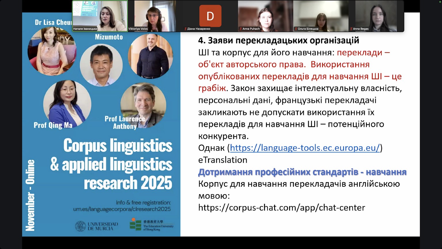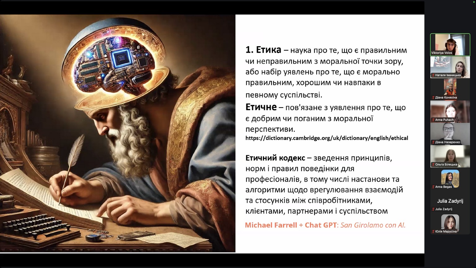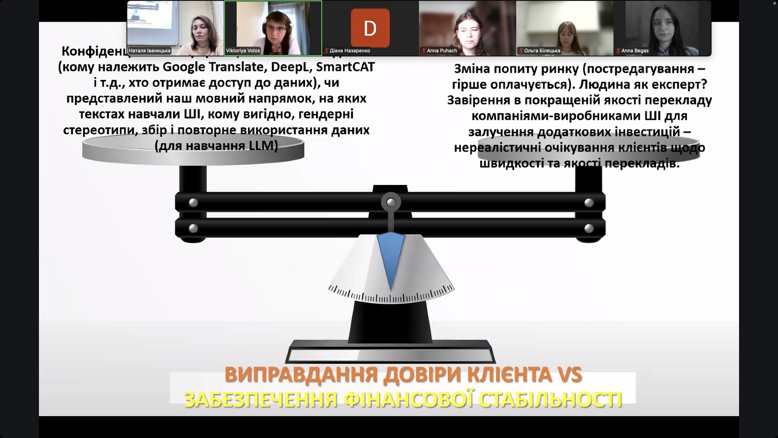 Під час зустрічі спікерка поділилася практичним досвідом застосування інструментів штучного інтелекту (AI) у професійній перекладацькій діяльності, розглянула етичні аспекти автоматизації перекладу, питання відповідальності перекладача, конфіденційності даних, а також ризики та виклики, пов’язані з використанням нейромереж у роботі зі спеціалізованими текстами.
