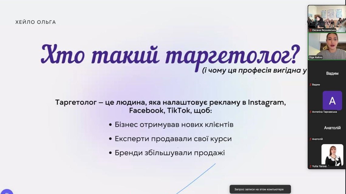 Протягом трьох днів Ольга Хейло, таргетолог і експерт з продажів – поділилася реальними кейсами, порадами та покроковими інструкціями зі створення рекламних кампаній у Facebook та Instagram. Здобувачі вищої освіти дізналися: