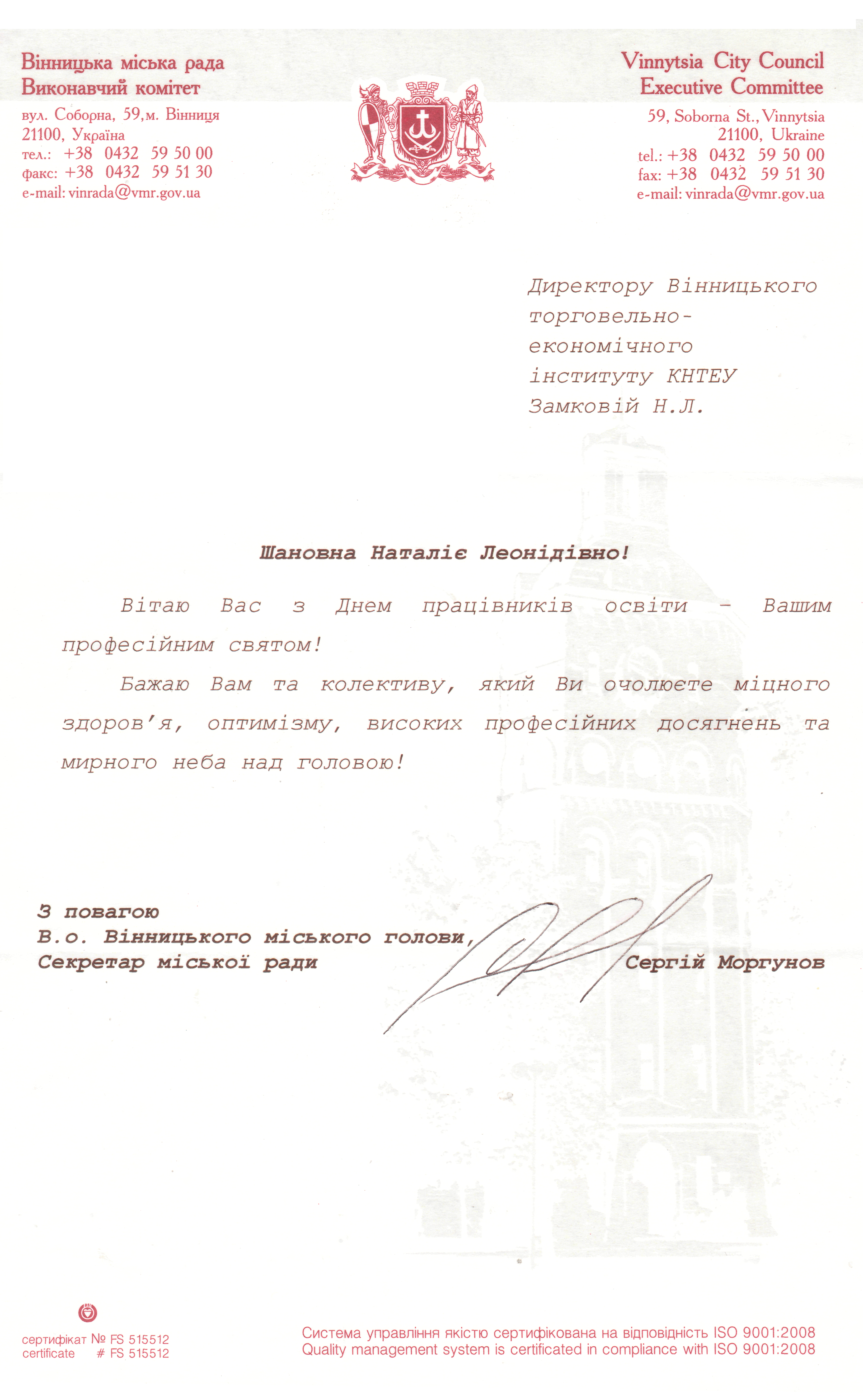 Вітання в.о. Вінницького міського голови, секретаря міської ради С.А.Моргунова з Днем працівників освіти.