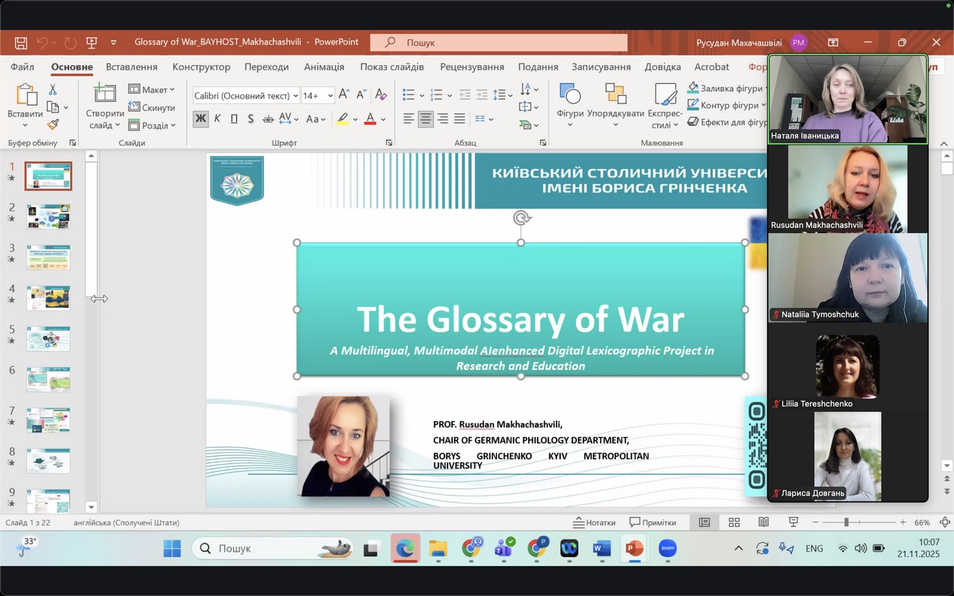 21 листопада 2025 р. відбулася змістова гостьова лекція відомої в Україні та світі лінгвістики та дослідниці цифрових технологій, експертки Європейської Комісії з оцінки міжнародних грантових проєктів рамкових програм Горзонт 2020, Горизонт Європа, члена експертної групи Oxford English Dictionary Advisory Group (Оксфордський університет, Великобританія), члена Європейської Асоціації Цифрової Гуманітаристики (Австрія) та Європейської лексикографічної асоціації ELEXIS Association проф. Русудан Махачашвілі (Київський столичний університет імені Бориса Грінченка). Лекцію на тему «Словник війни» було проведено для магістрів ОП «Германські мови та літератури (переклад включно), перша – англійська» в межах ОК «Цифрові філологічні технології».