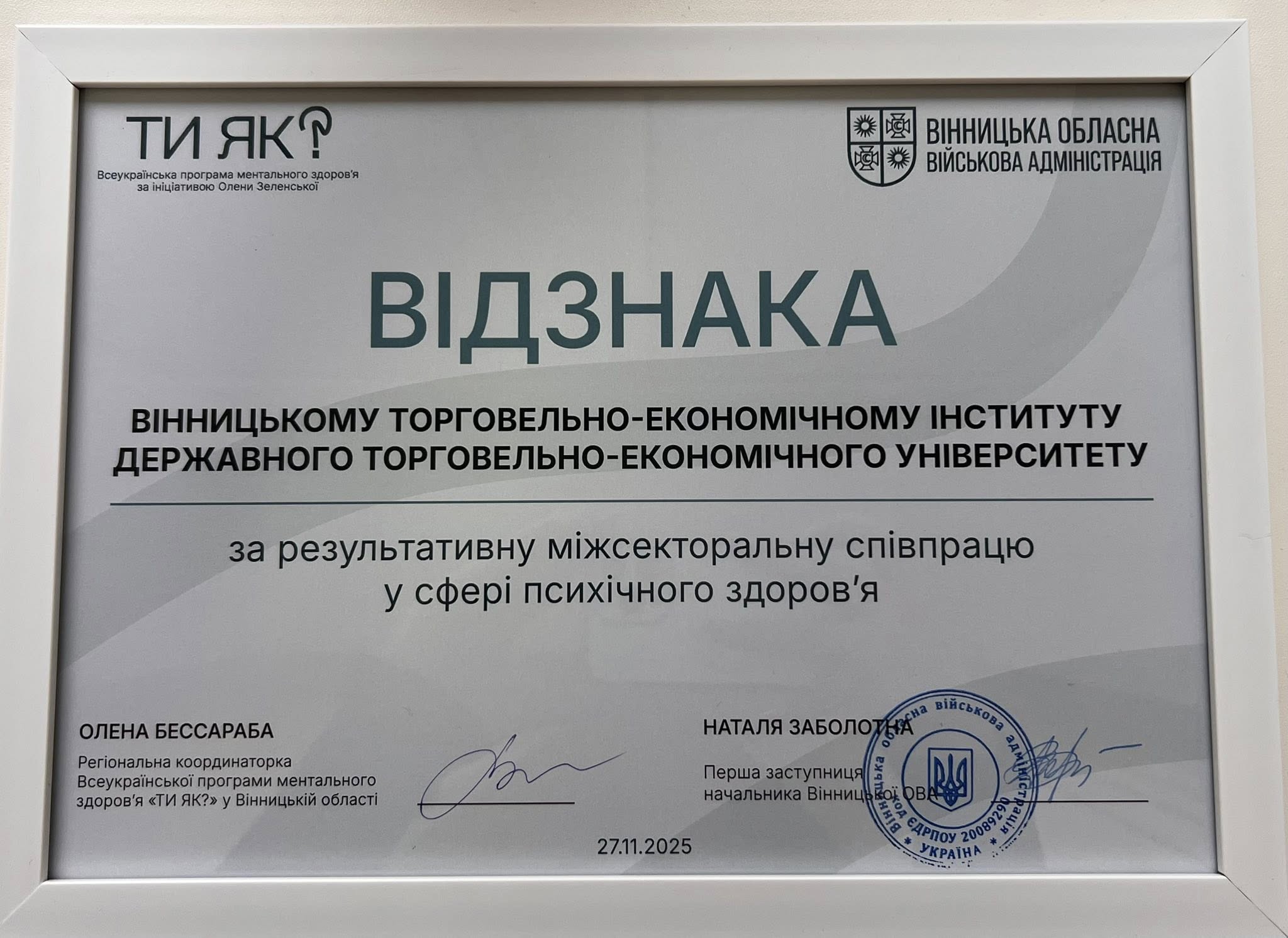 ВТЕІ ДТЕУ вручено відзнаку за результативну між секторальну співпрацю у сфері психічного здоровʼя