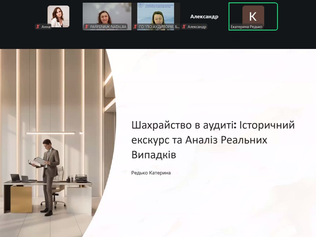 Спікерами освітнього заходу виступили аудитори-практики Наталія Парфенюк, Катерина Редько, Олена Михайлова, Юрій Циганок, які поділилися професійним досвідом, практичними кейсами та актуальними підходами до оцінювання ризиків шахрайства в аудиторській практиці.