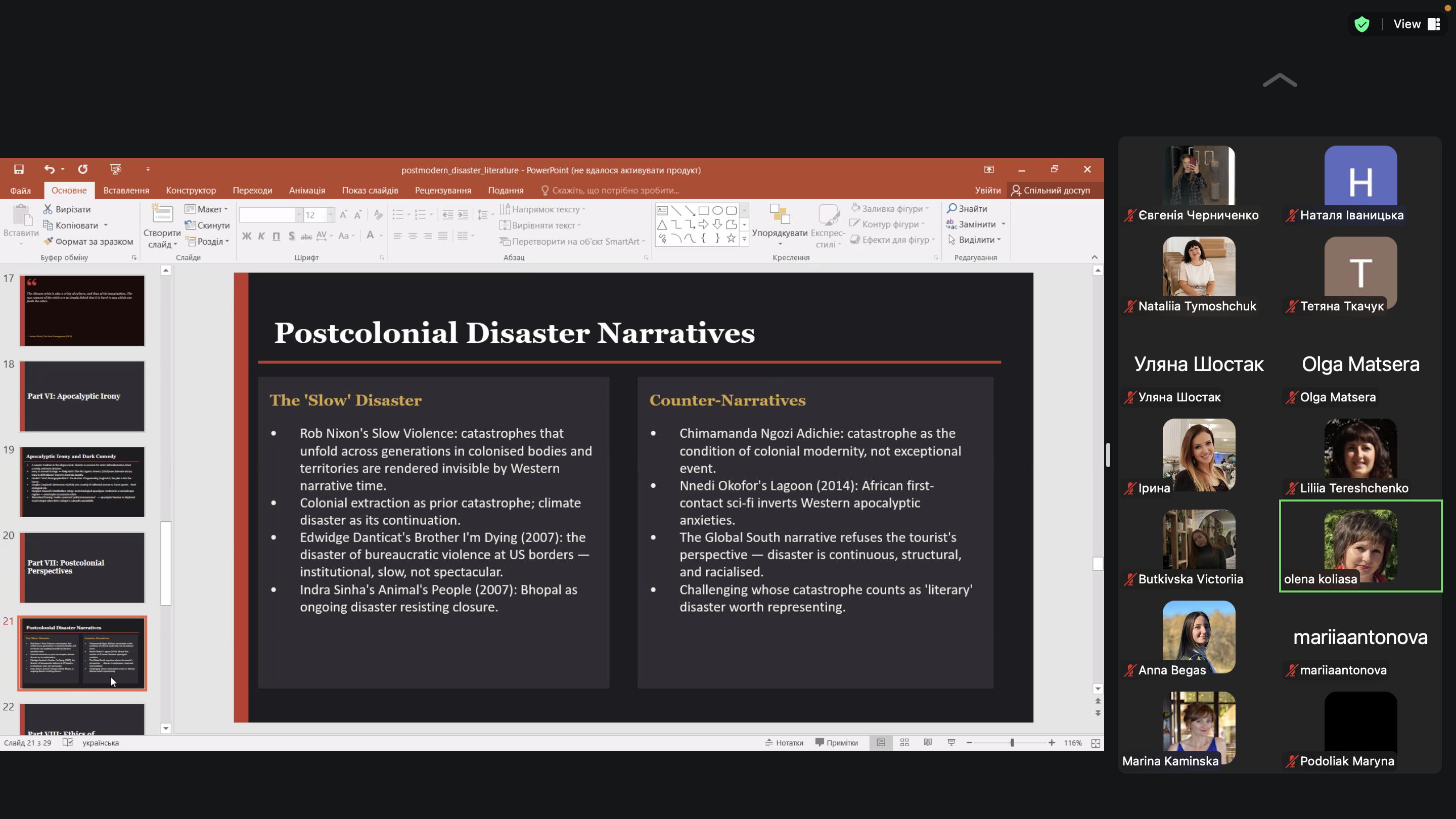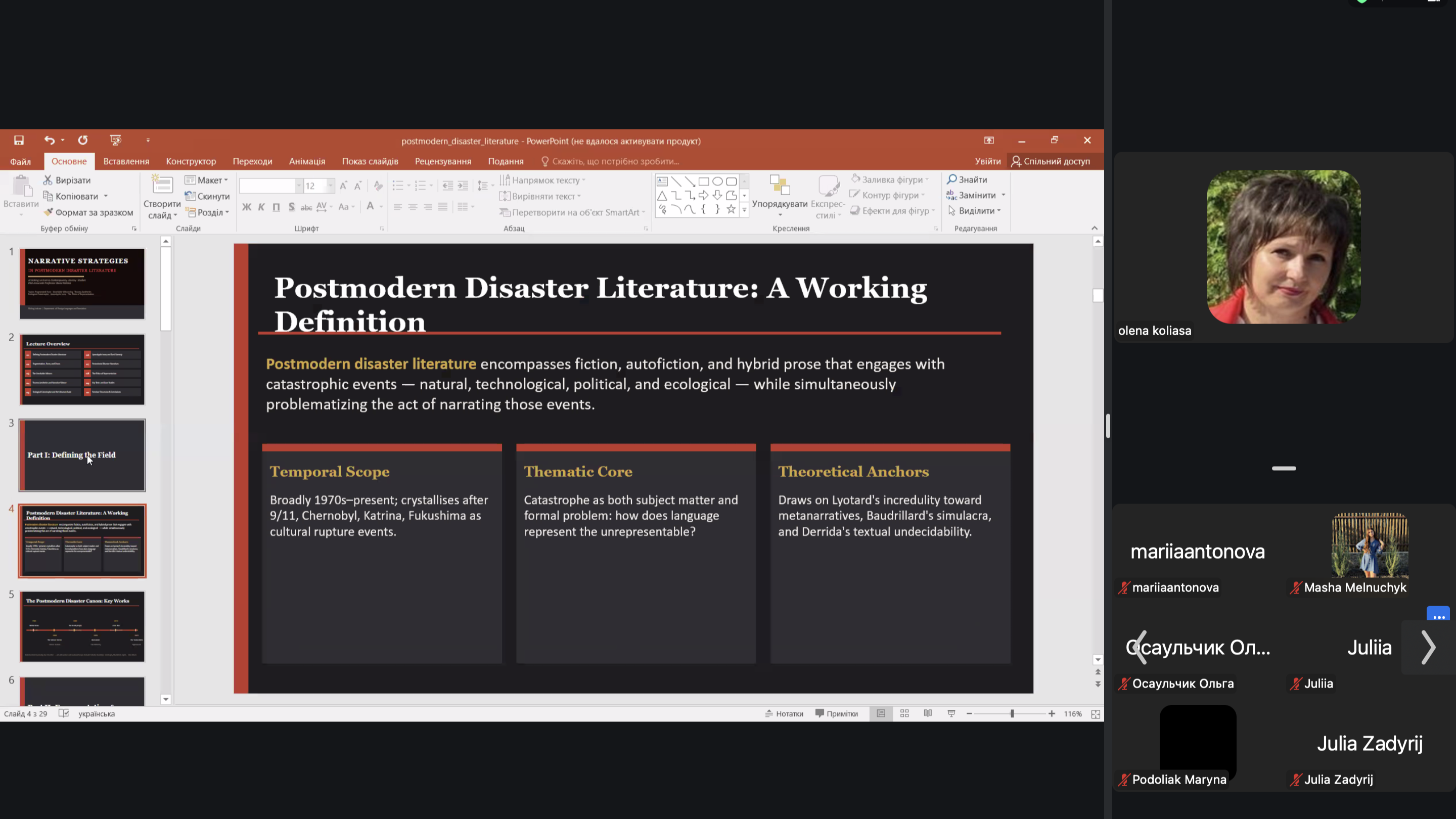 Гостьова лекція «Narrative Strategies in Postmodern Disaster Literature» від Олени Коляси