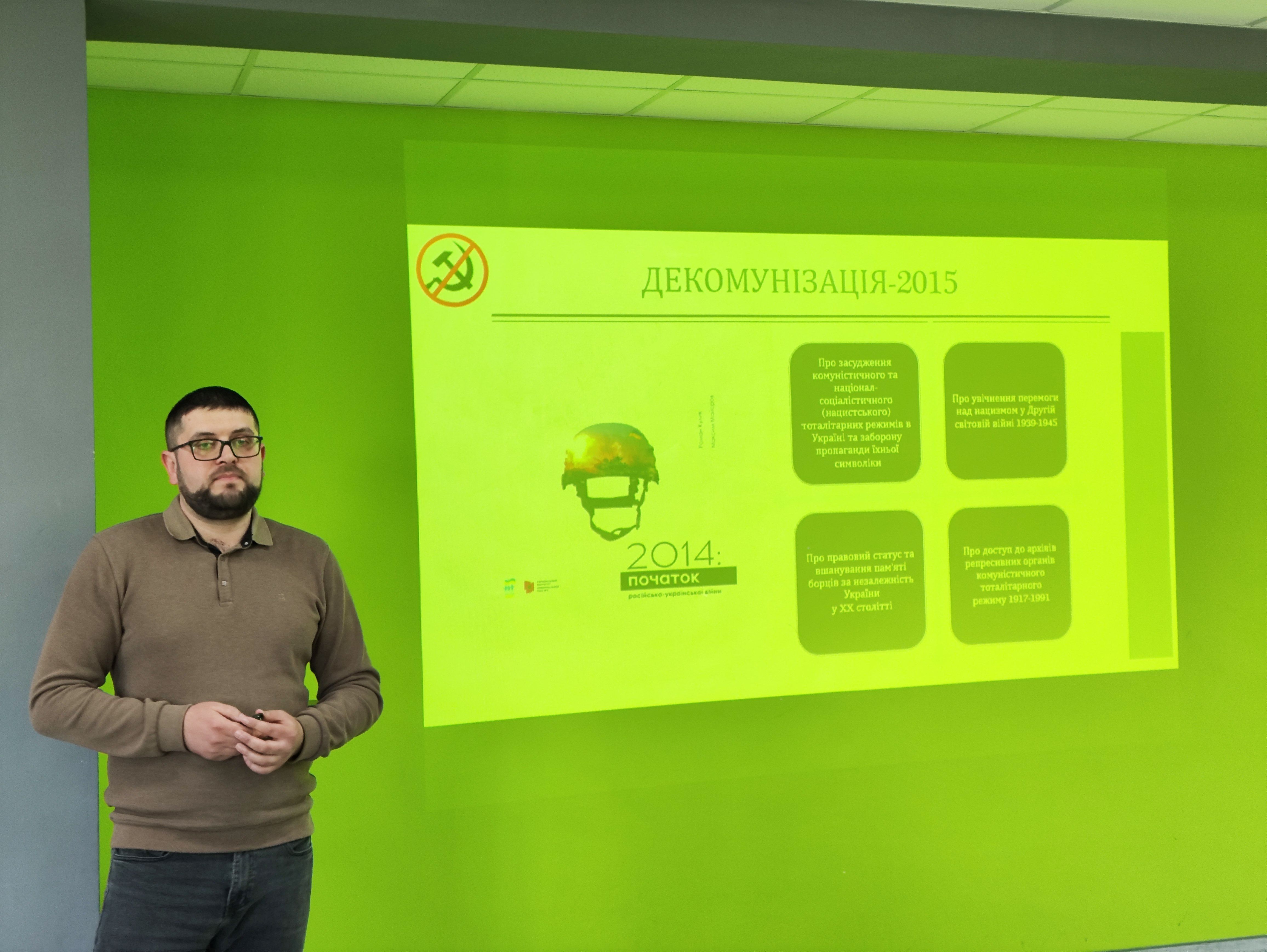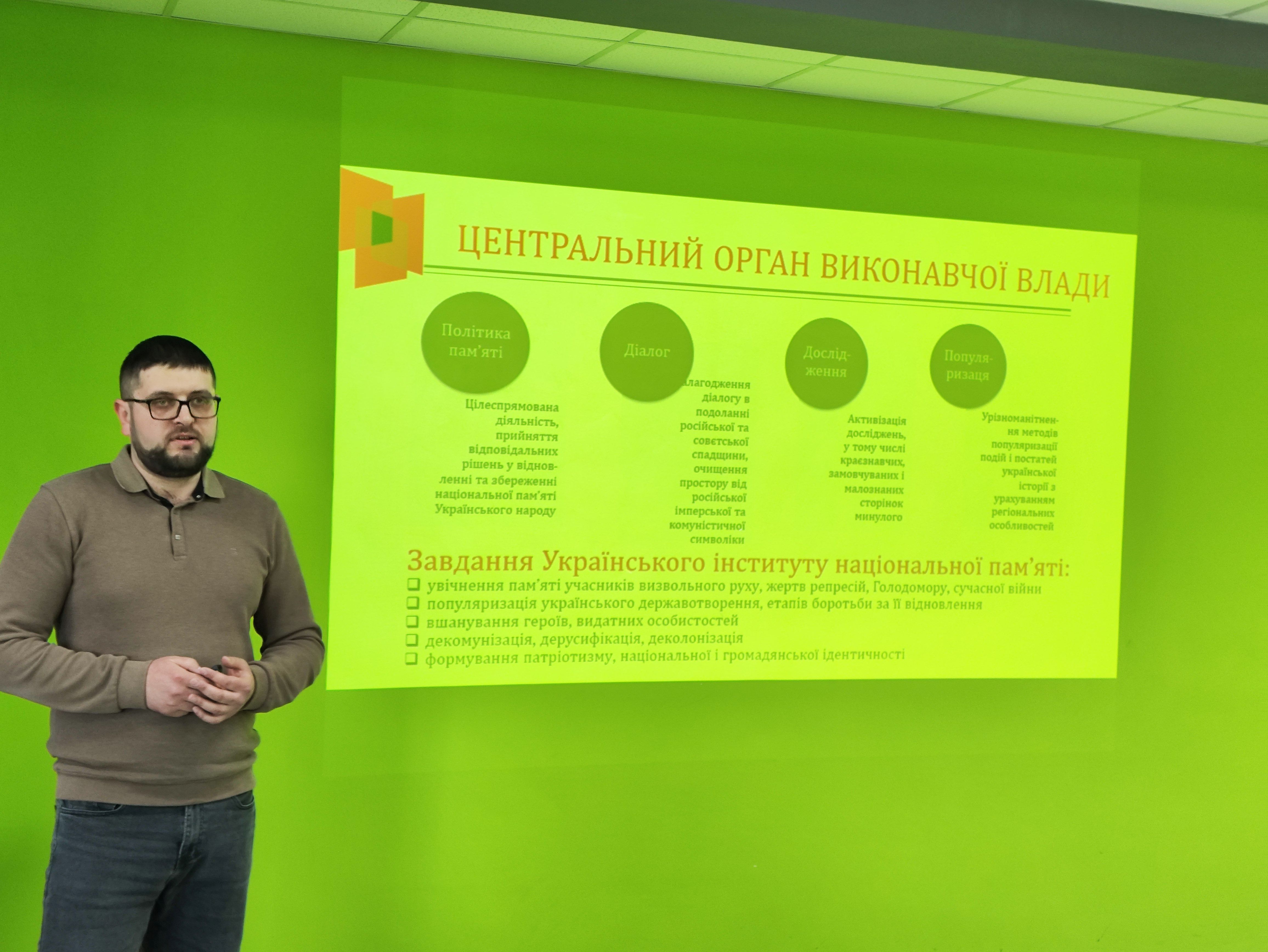 У ході лекції було розкрито роль державної політики національної пам’яті у формуванні стійкості суспільства до зовнішніх інформаційних впливів. Особливу увагу приділено питанню того, як маніпуляції історією, нав’язування викривлених історичних наративів та збереження радянських символічних маркерів у публічному просторі можуть використовуватися як інструменти гібридної агресії. Спікер проаналізував наслідки тривалої окупаційної політики в гуманітарному вимірі, зокрема: маніпулювання історією для виправдання агресії проти України; нав’язування дискурсів на кшталт «так склалося історично»; формування комплексу меншовартості та синдрому «молодшого брата»; нерезистентність частини суспільства до ворожої пропаганди. Окремо обговорено практичні аспекти реалізації політики пам’яті на місцевому рівні, інструменти декомунізації, деколонізації, а також роль органів публічної влади у формуванні національної ідентичності.
