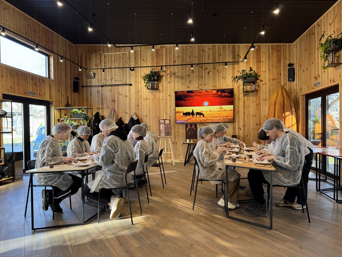 Друга частина відвідування підприємства була представлена майстер-класом, в ході якого здобувачі вищої освіти під керівництвом досвідчених фахівців випробували себе в якості шоколотьє – навчилися розрізняти види шоколаду, працювати з професійним кондитерським інвентарем та створювати власні десерти.