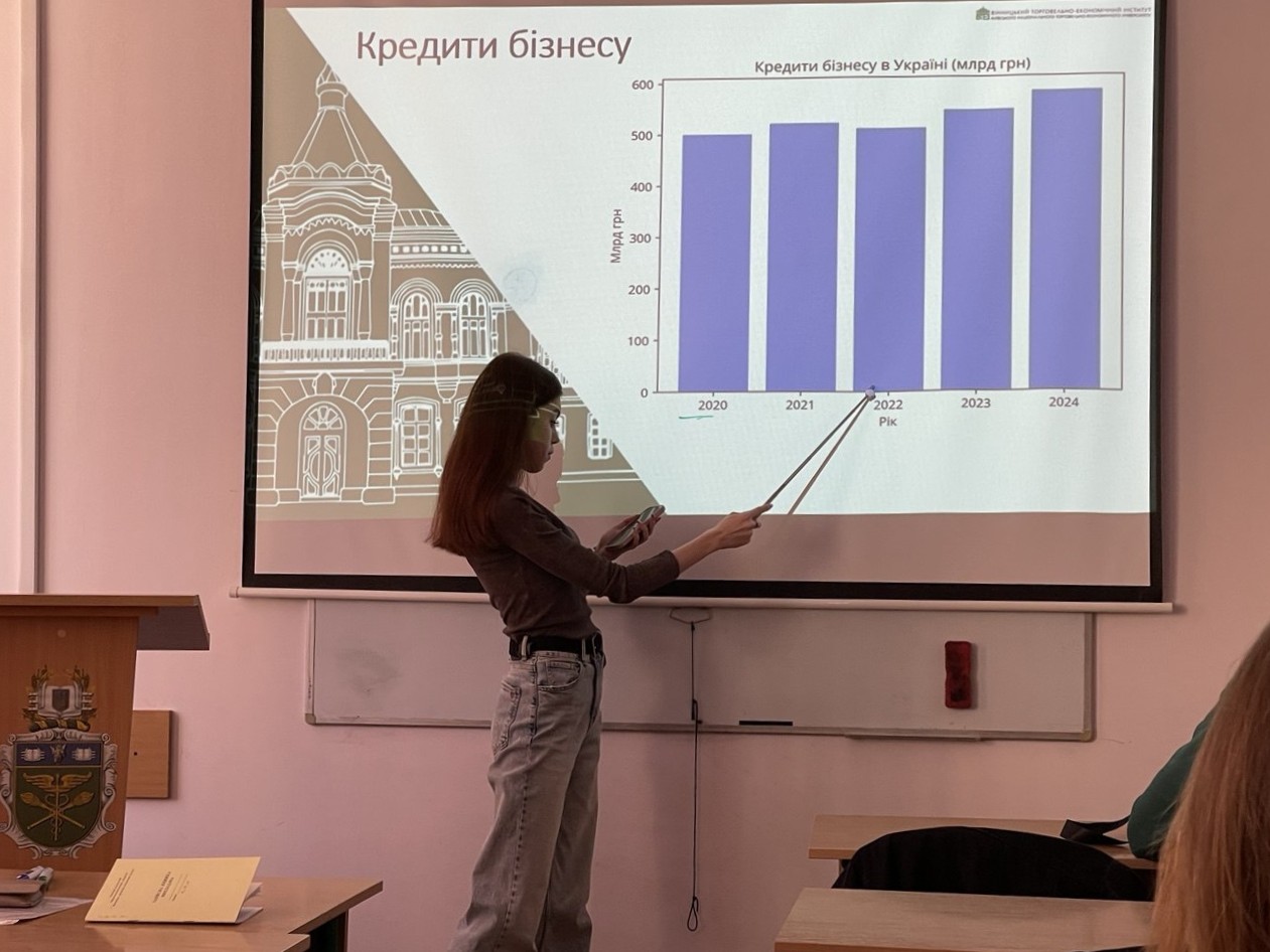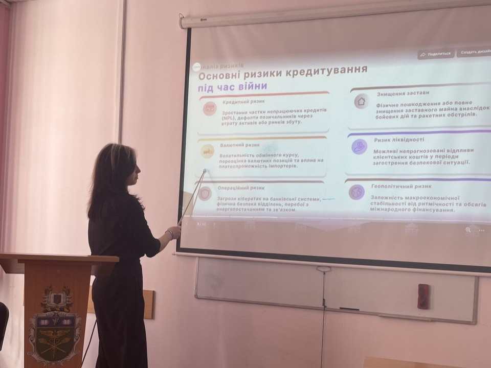 Савчук Даша виступила з доповіддю на тему «Кредитування в Україні: виклики воєнного стану та трансформація ризиків». Особливості депозитної політики банків в умовах війни в Україні висвітлила в своєму виступі Волощук Анна, наголосивши, що завдяки виваженому регулюванню з боку НБУ обсяги залучених на банківські депозити ресурсів зросли, не зважаючи на загрози воєнного стану. Горофянюк Ірина розкрила механізм врегулювання проблемних банківських кредитів. Допомога міжнародних фінансових організацій Україні через банківську систему була висвітлена у доповіді Забуранної Анни. Найбільш гострі проблеми кредитування економіки України в своїй презентації розкрила Григоренко Єлизавета. Іщук Анастасія виступила з доповіддю на тему «Споживче кредитування в Україні: сучасний стан та перспективи» , в якій розкрила динаміку, структуру споживчого кредитування в сучасних умовах і окреслила головні проблеми у забезпеченні своєчасного повернення кредитів. Велику зацікавленість викликала доповідь Кіпоренко Маріі на тему «Фонд гарантування вкладів фізичних осіб та його роль у захисті вкладників», в якій переконливо довела значення діяльності цього фонду, зокрема гарантування повернення 100% вкладів протягом дії воєнного стану і ще 3-х місяців після його скасування.