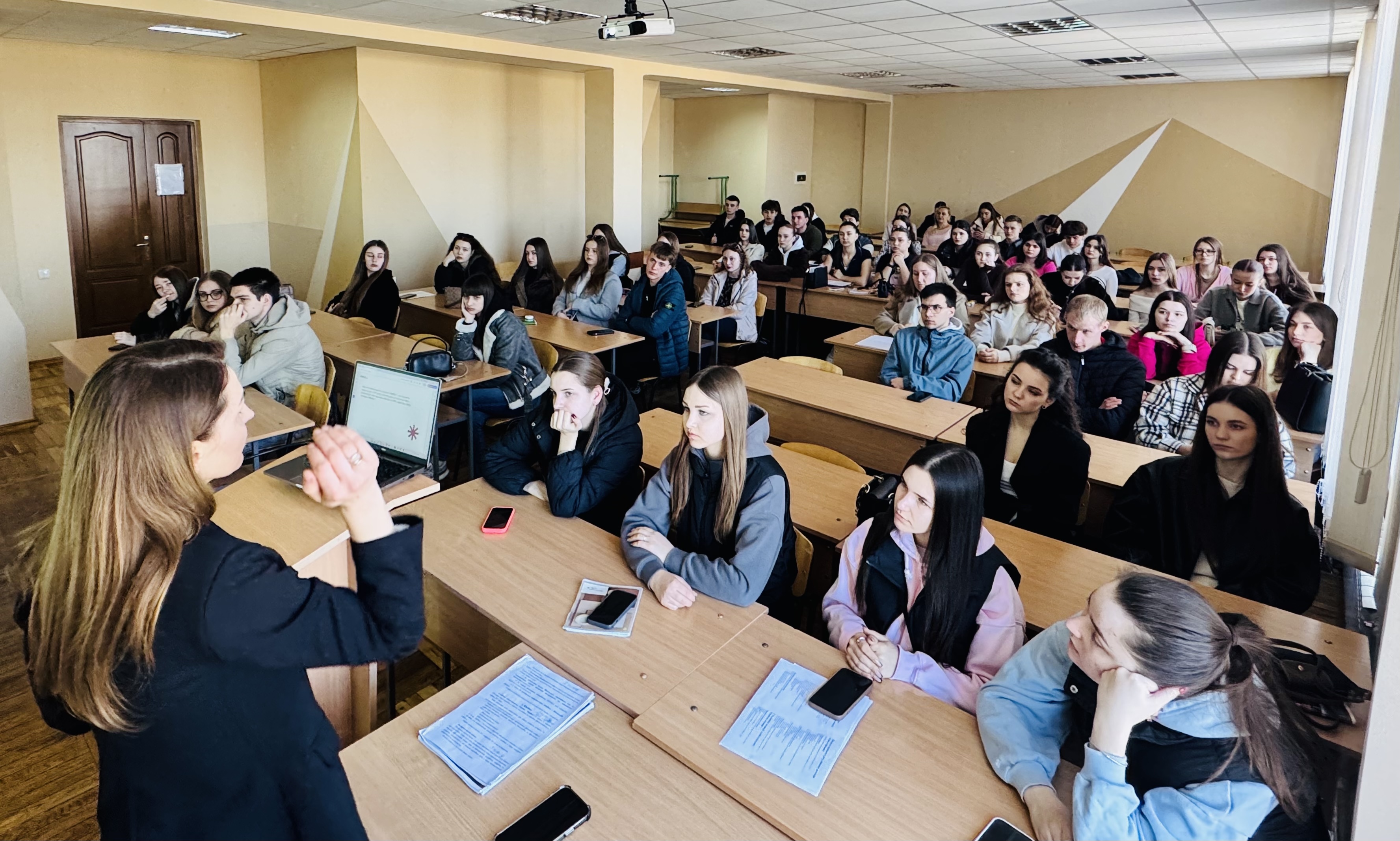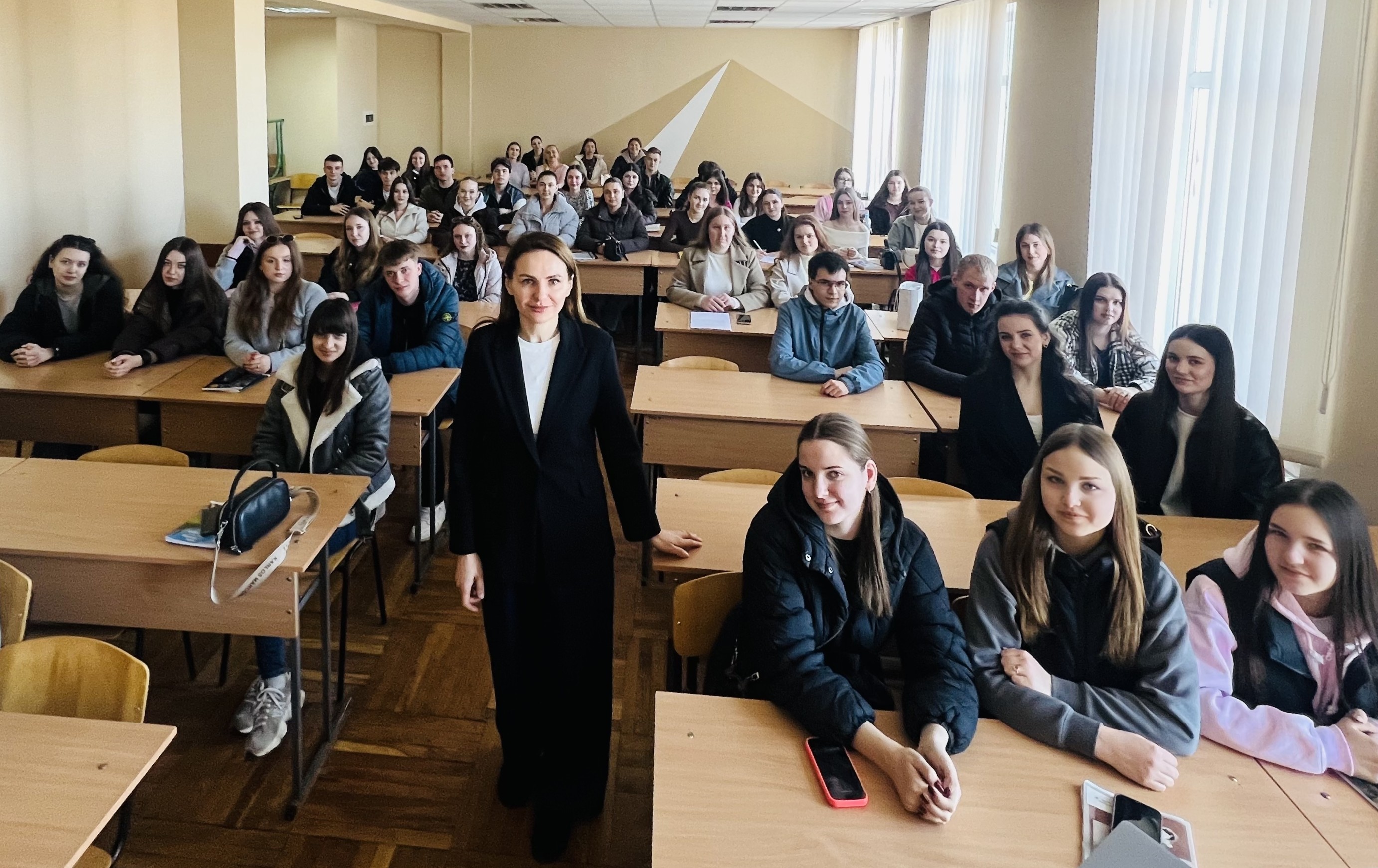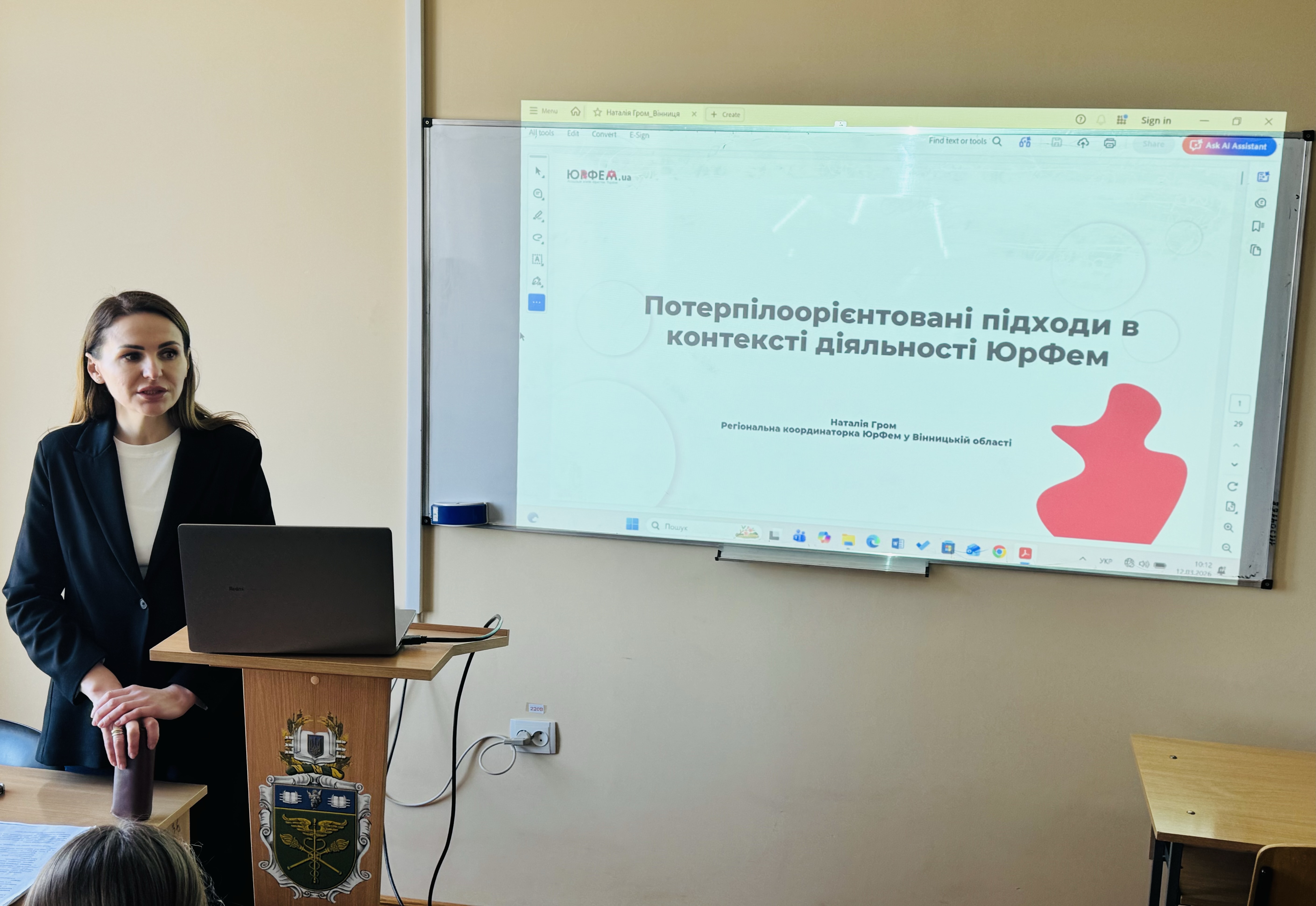 Пані Наталя розповіла студентам про діяльність організацій, які вона представляє, зокрема про Асоціацію жінок-юристок України «ЮрФем». Це громадська організація, яка об’єднує жінок, що працюють у юридичній сфері, та займається захистом прав жінок і утвердженням гендерної рівності в Україні. Організацію створено у 2017 році, а її діяльність спрямована на підтримку жінок, розвиток правничої спільноти та боротьбу з дискримінацією.