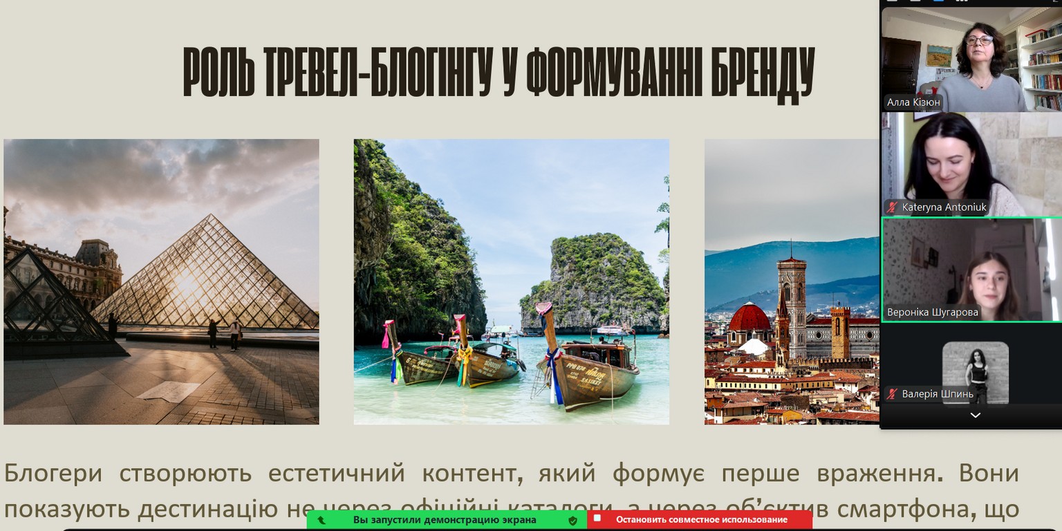 - Шугарова Вероніка, здобувач вищої освіти ОС «бакалавр» ОП «Туризм» групи Т-41д з доповіддю на тему «Роль тревел-блогінгу для формування бренду туристичної дестинації»;