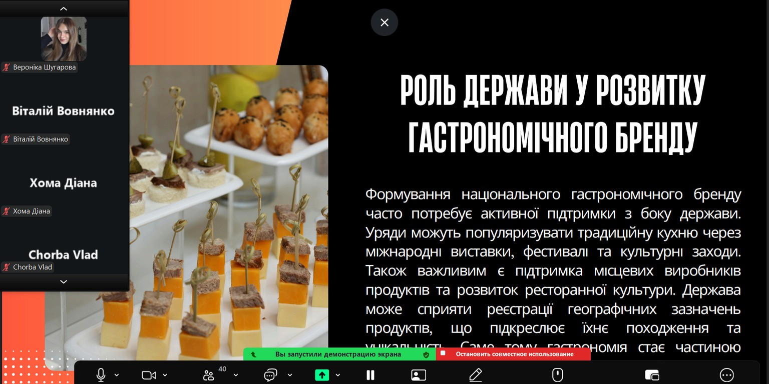- Конопельнюк Дарія, здобувач вищої освіти ОС «магістр» ОП «Готельно-ресторанна справа» групи ГРС-11д(м) з доповіддю на тему «Національний бренд через гастрономію»;