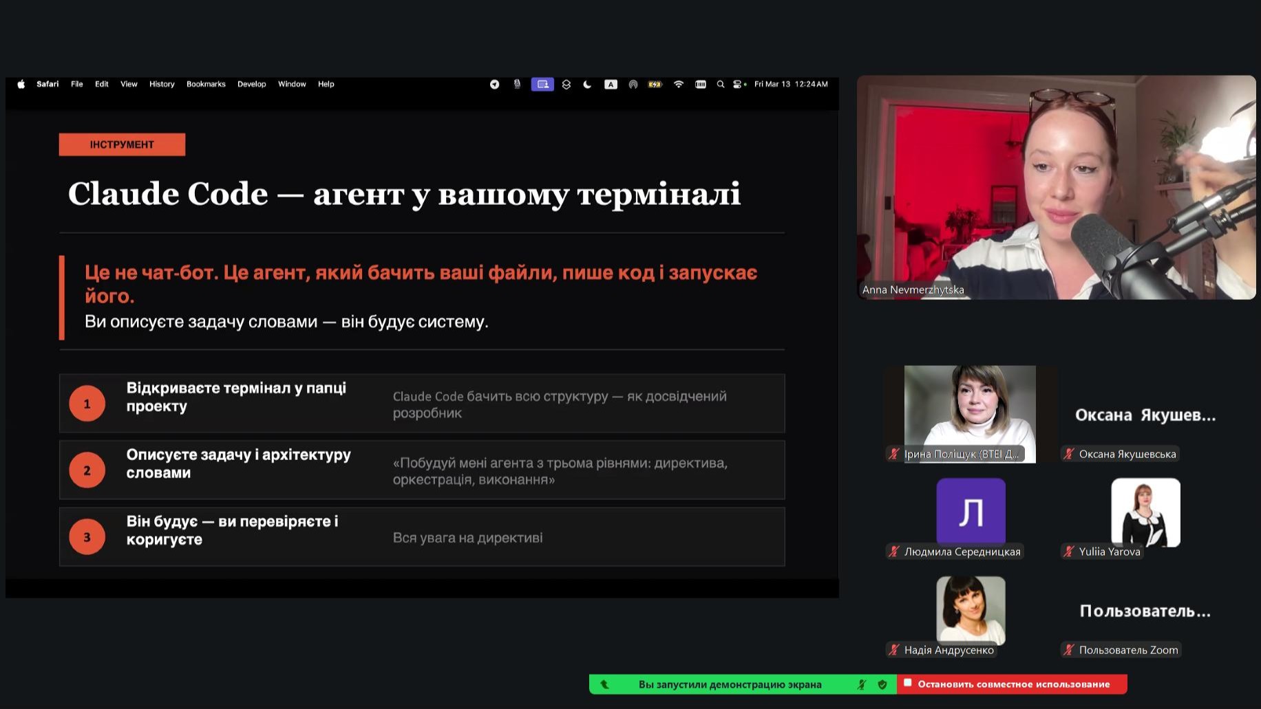 Під час лекції спікерка також продемонструвала практичні можливості використання різних програм штучного інтелекту для автоматизації маркетингових процесів. Зокрема було представлено роботу з інструментом Claude Code, який дозволяє створювати AI-агентів для аналізу інформації, генерації контенту та автоматизації окремих маркетингових завдань. Така демонстрація дала учасникам можливість ознайомитися з сучасними цифровими інструментами, що активно використовуються у технологічних компаніях США.