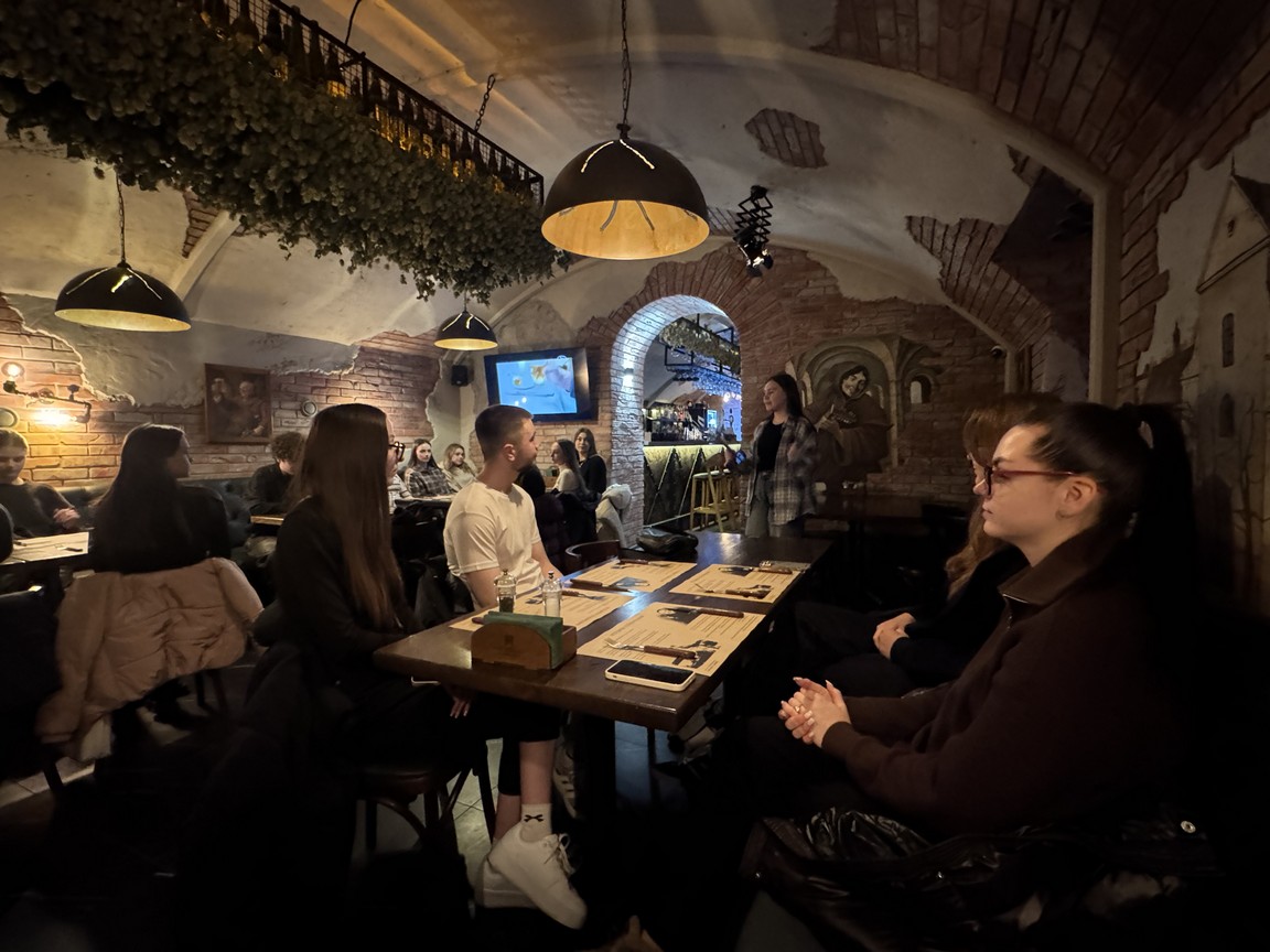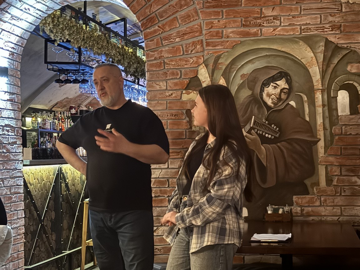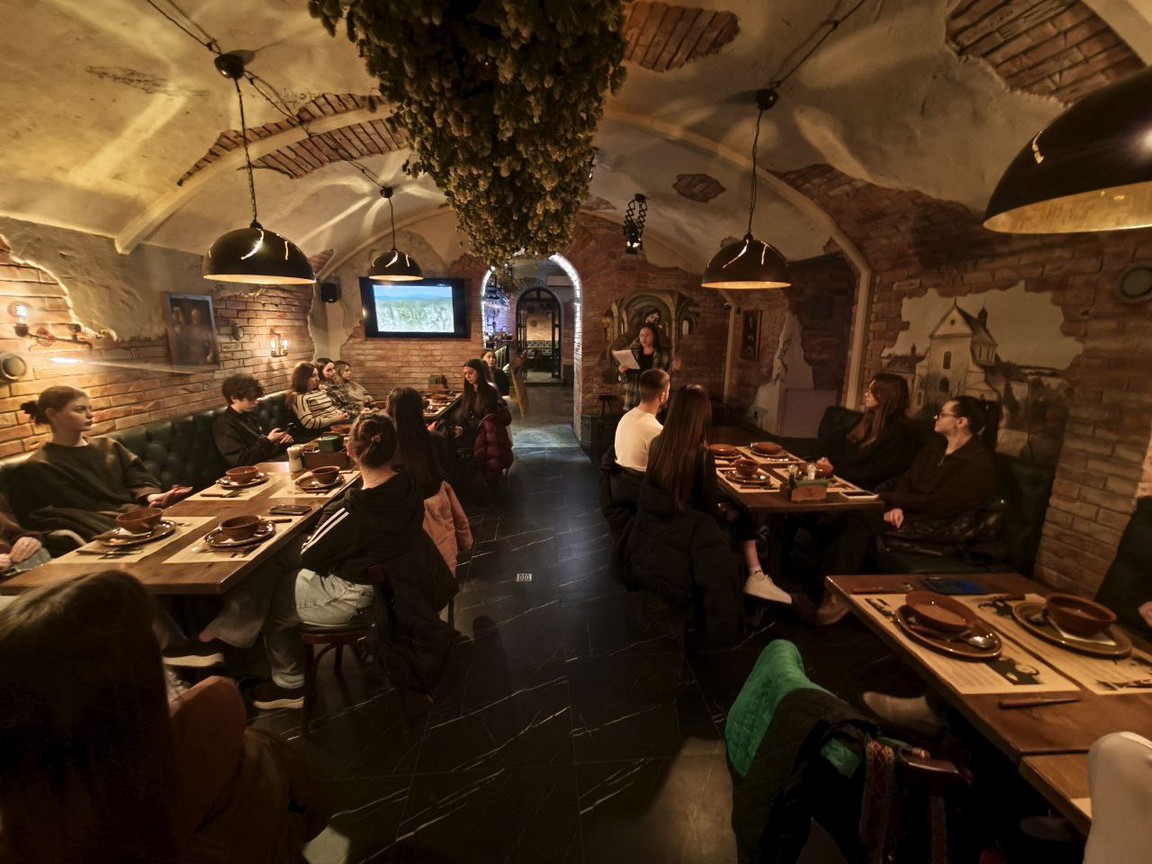 На занятті майбутні фахівці ознайомилися з унікальною концепцією ресторану, що поєднує автентичну атмосферу з сучасними стандартами сервісу, детально вивчили особливості організації технологічних процесів, формування меню на основі локальних гастрономічних традицій та специфіку управління клієнтським досвідом у тематичному закладі.