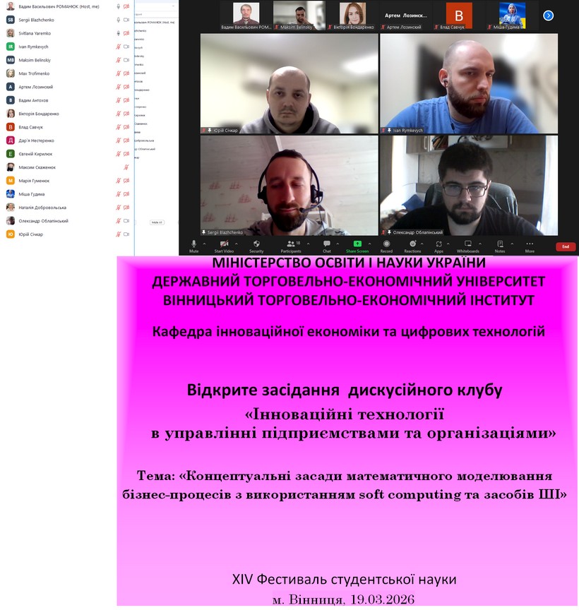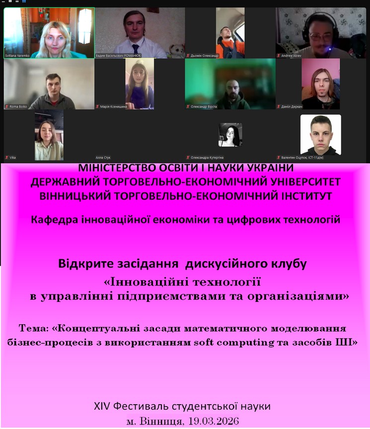 19 березня 2025 року в рамках проведення XIV Фестивалю студентської науки на факультеті економіки, менеджменту та права проведено відкрите засідання дискусійного клубу «Інноваційні технології в управлінні підприємствами та організаціями» на тему «Концептуальні засади математичного моделювання бізнес-процесів з використанням soft computing та засобів ШІ». В засіданні дискусійного клубу взяли участь здобувачі ОС «магістр» та «бакалавр» освітньої програми «Інформаційні технології у підприємництві» денної форми навчання, науково-педагогічні працівники кафедри інноваційної економіки та цифрових технологій.