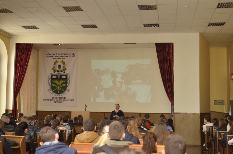 31 березня перед студентами виступила відомий волонтер Юлія Вотчер, президент ГО «МОЛЬФАР», яка не зважаючи на небезпеку та обстріли доставляє гуманітарну допомогу в гарячі точки зони АТО. Відбулася бесіда з показом фотографій. За кожною фотографією студенти побачили людську долю.