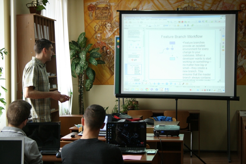 У рамках семінару програміст-розробник мобільних додатків компанії Delphi Янощук В’ячеслав Віталійович провів практичний командний тренінг в середовищі розподіленої системи керування версіями файлів та спільної роботи Git. По завершенню семінару присутнім було вручено сертифікати про підвищення кваліфікації з напряму «Економіка та підприємництво».