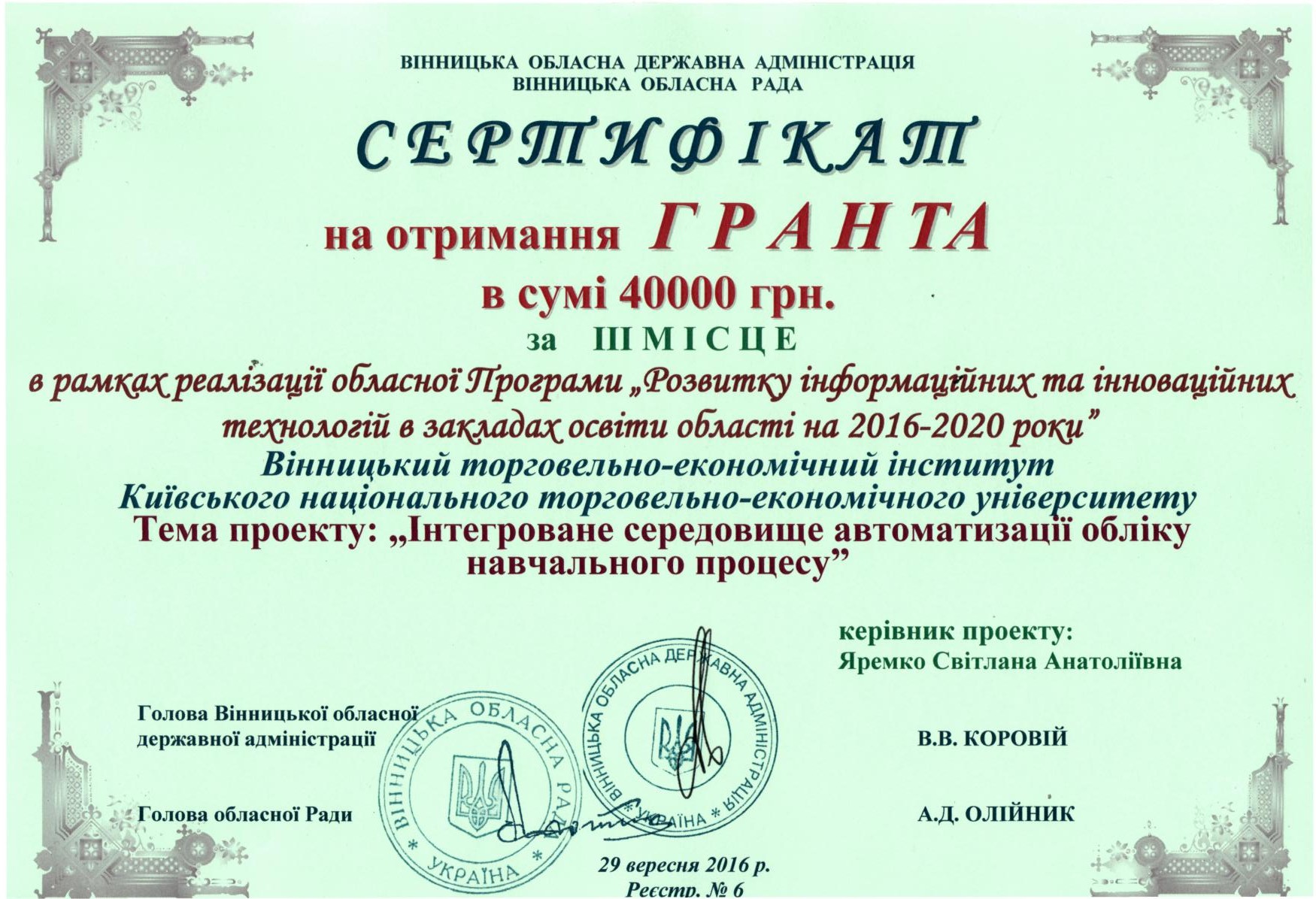 Також Вінницькому торговельно-економічному інституту КНТЕУ було вручено сертифікат на отримання гранту в сумі 40 000 грн за ІІІ місце в рамках реалізації обласної Програми «Розвитку інформаційних та інноваційних технологій в закладах освіти області в 2016-2010 р.р.» (тема проекту: «Інтегроване середовище автоматизації обліку навчального процесу», керівник проекту – к.т.н., доц.. Яремко С.А.)