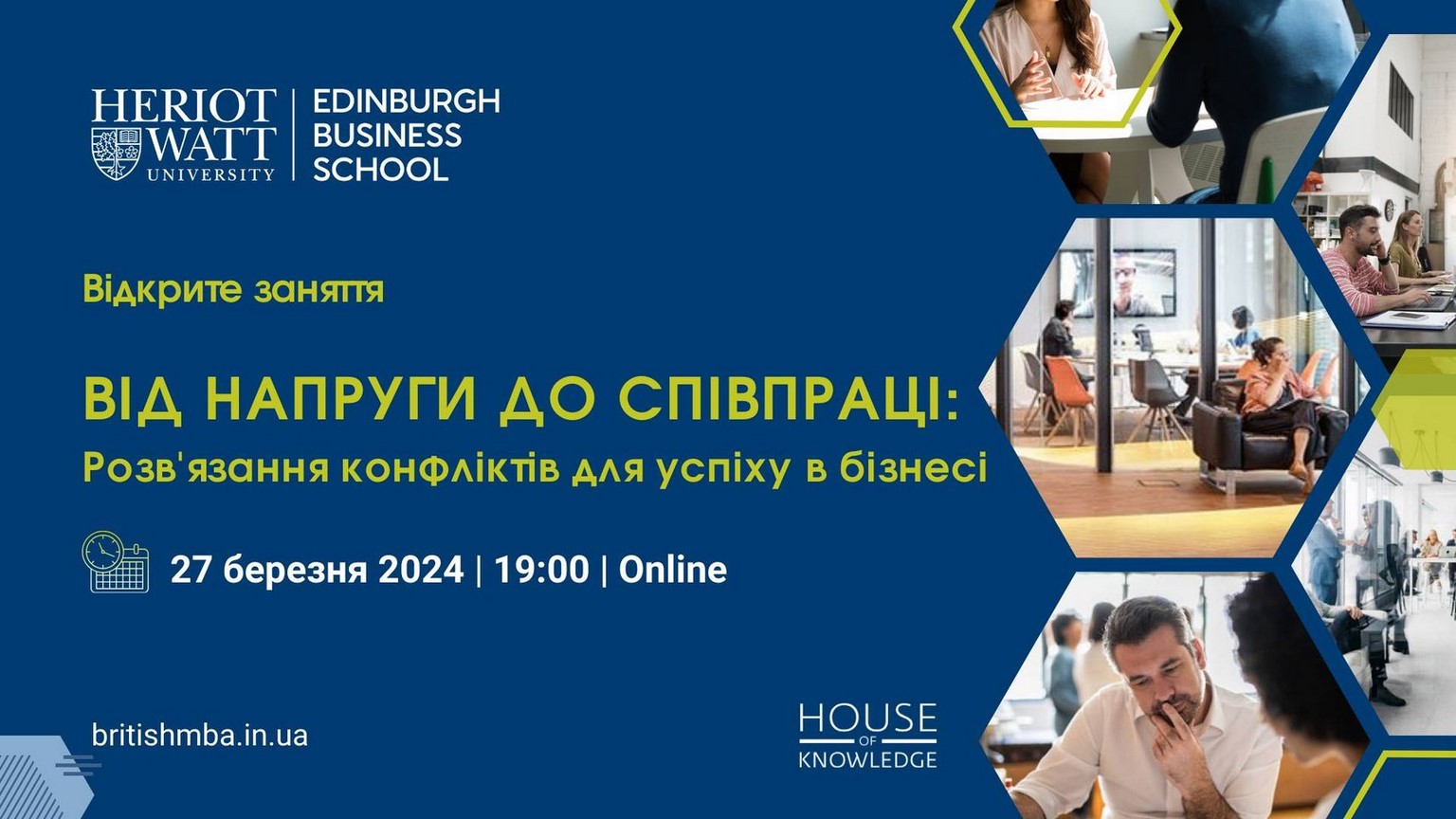 27 березня 2024 року викладачі кафедри економіки та міжнародних відносин та здобувачі ОС «бакалавр» та «магістр» ОП «Економіка бізнесу», «Економіка підприємства» та «Міжнародний бізнес» приєдналися до відкритого заняття Edinburgh Business School at House of Knowledge на тему «Від напруги до співпраці: Розв’язання конфліктів для успіху в бізнесі» за участі Олени Ковальчук, тьюторки Edinburgh Business School at House of Knowledge та Людмили Демченко, керуючої партнерки іспанської консалтингової компанії UCBI, випускниці програми МВА ЕБШ.