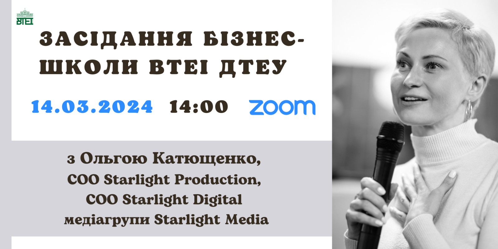 14 березня 2024 року слухачі Бізнес-школи ВТЕІ ДТЕУ брали участь в онлайн-зустрічі з Ольгою Катющеко, операційним директором Starlight Production та Starlight Digital. Ця зустріч стала чудовою можливістю для учасників дізнатися більше про внутрішні механізми та стратегії найбільшої медіакомпанії в Україні.