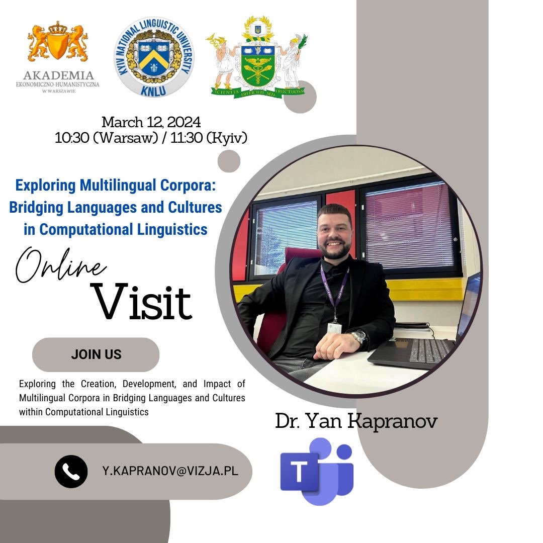 12 березня доктор філологічних наук, професор Ян Капранов (Економіко-гуманітарна академія у Варшаві) на запрошення кафедри іноземної філології та перекладу провів гостьову лекцію-тренінг «Exploring Multilingual Corpora: Bridging Languages and Cultures in Computational Linguistics».