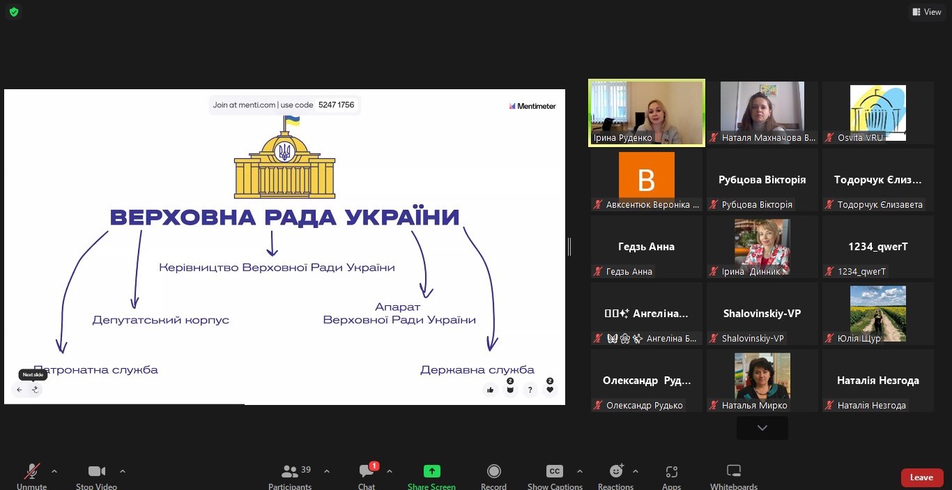 19 грудня 2023 року за ініціативи кафедри менеджменту та адміністрування ВТЕІ ДТЕУ Освітнім Центром Верховної Ради України було проведено парламентське онлайн-заняття, на якому пані Ірина Руденко, публічний службовець Апарату Верховної Ради, розповіла про призначення, структуру та функції єдиного законодавчого органу України.