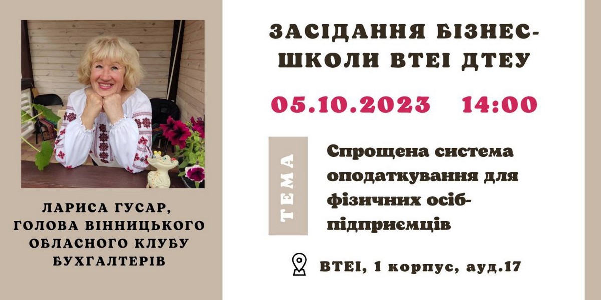 5 жовтня 2023 року відбулася зустріч слухачів Бізнес-школи ВТЕІ ДТЕУ з Гусар Ларисою Миколаївною, головою Вінницького обласного клубу бухгалтерів.