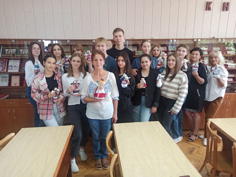 Пані Ніна ознайомила здобувачів вищої освіти та співробітників бібліотеки з історією виникнення ляльки-мотанки, її сакральним значенням, різновидами та технікою виконання. Бібліотекарі доповнили захід тематичною книжково-ілюстративною виставкою «Дарунок у спадок».