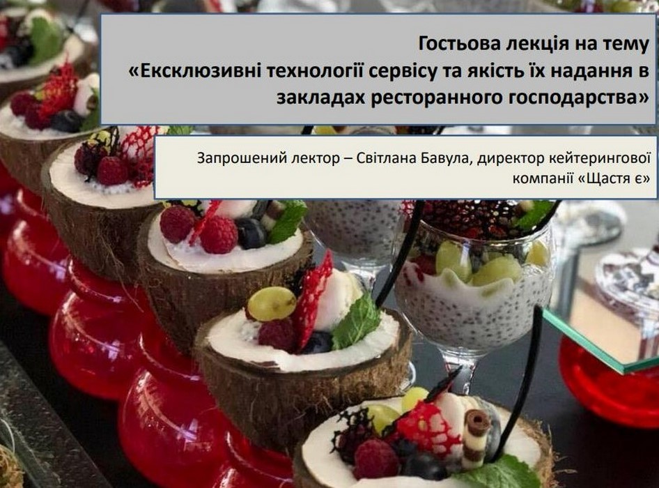 20 вересня для здобувачів вищої освіти за освітніми програмами «Ресторанні технології», «Готельно-ресторанна справа», «Міжнародний туристичний бізнес» ОС «магістр» у рамках вивчення освітніх компонентів «Концепції та ресторанний креатив», «Управління якістю послуг в готелях та ресторанах» проведено гостьову лекцію на тему «Ексклюзивні технології сервісу та якість їх надання в закладах ресторанного господарства». Запрошений лектор – Світлана Бавула, фахівець-практик, директор кейтерингової компанії «Щастя є», одного з провідних операторів на ринку кейтерингових послуг у м. Вінниця.