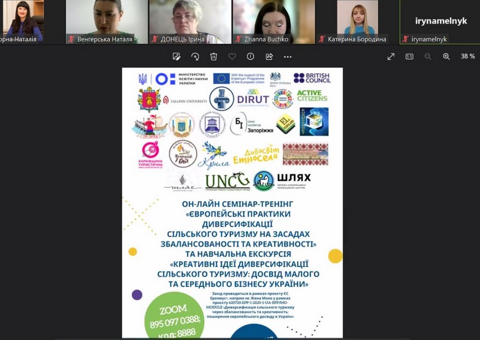 26-27 травня 2023 року науково-педагогічні працівники кафедри туризму та готельно-ресторанної справи брали участь в онлайн семінарі-тренінгу «Європейські практики диверсифікації сільського туризму на засадах збалансованості та креативності», спрямованому на ознайомлення з успішними практиками у сфері сільського туризму й надання рекомендацій щодо створення кластерів та креативних мереж сільського туризму на основі співпраці бізнесу, територіальних громад, наукових установ, бізнес-інкубаторів та представників державної влади.