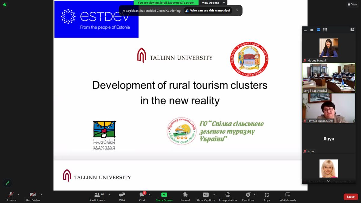 12 травня 2023 року науково-педагогічні працівники кафедри туризму та готельно-ресторанної справи, здобувачі вищої освіти за спеціальністю 242 «Туризм» взяли участь у круглому столі на тему «Розвиток кластерів сільського зеленого туризму в нових реаліях», організованому Київським національним університетом імені Тараса Шевченка за результатами реалізації проєкту «Покращення малого бізнесу та розвиток системи університетської освіти через дослідження та прочування туристичних кластерів у сільській місцевості в Україні», що фінансується Естонським центром міжнародного розвитку.