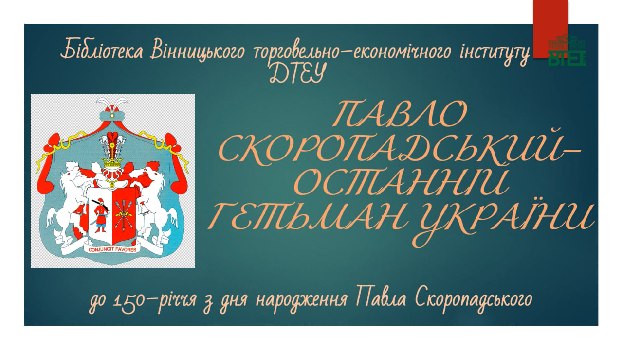 15 травня виповнюється 150 років від дня народження Павла Петровича Скоропадського - гетьмана України, українського державного, політичного і громадського діяча. Постать Павла Скоропадського привертає увагу своєю неординарністю. Будучи вправним військовим, громадським та політичним діячем, він самостійно зрікся влади та увійшов в історію, як останній гетьман України. Про характер, звички та психологічний портрет Скоропадського відомо досить мало. Нам вдалося знайти цікаві факти, які допоможуть зрозуміти краще його особистість. З цієї нагоди бібліотека ВТЕІ ДТЕУ підготувала віртуальну виставку «Павло Скоропадський – останній гетьман України» https://youtu.be/z17ZzeMv7qw
