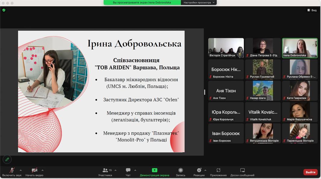 10 травня 2023 року відбулася зустріч студентів освітнього ступеня «магістр» ОП «Міжнародний бізнес», ОП «Економіка підприємства», освітнього ступеня «бакалавр» ОП «Міжнародний бізнес», ОП «Економіка бізнесу» з співвласницею ТОВ «Ariden», Варшава Польща. Поспілкувалися про особливості створення власного бізнесу в Польщі, розглянули основні кроки в реєстрації підприємства. Визначили перспективи співпраці українського бізнесу з європейськими компаніями. Студенти жваво дискутували щодо вибору умов поставки українських товарів у Польщу, оформлення митних документів та ролі міжнародного бізнесу у відбудові економіки України.