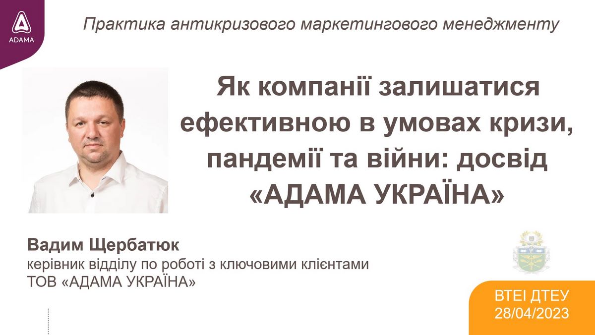 28 квітня 2023 року для здобувачів вищої освіти спеціальності 075 «Маркетинг» (освітня програма «Маркетинг» ОС «магістр») у рамках вивчення освітньої компоненти «Маркетинговий менеджмент» було проведено гостьовий практикум антикризового маркетингового менеджменту на тему «Як компанії залишатися ефективною в умовах кризи, пандемії та війни: досвід «АДАМА УКРАЇНА», запрошеним викладачем на якому виступив Вадим Щербатюк, керівник відділу по роботі з ключовими клієнтами відомої української компанії «АДАМА УКРАЇНА».