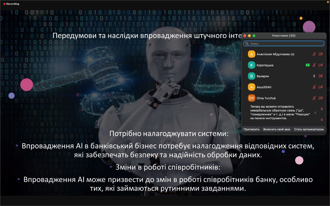 Студентка 2 курсу групи ФБСС-21д Харковенко Олена виступила із доповіддю на тему «Інтернет-банкінг в умовах нестабільності». Круглий стіл пройшов дуже цікаво, студенти активно задавали питання та вступали в дискусії.