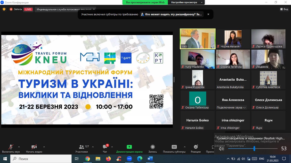 21 березня 2023 року науково-педагогічні працівники кафедри туризму та готельно-ресторанної справи та здобувачі вищої освіти за спеціальністю 242 «Туризм» (освітні програми «Туризм» ОС «бакалавр», «Міжнародний туристичний бізнес» ОС «магістр») взяли участь у Міжнародному туристичному форумі «Туризм в Україні: виклики та відновлення», організованому Київським національним економічним університетом імені Вадима Гетьмана за сприяння ДАРТ.