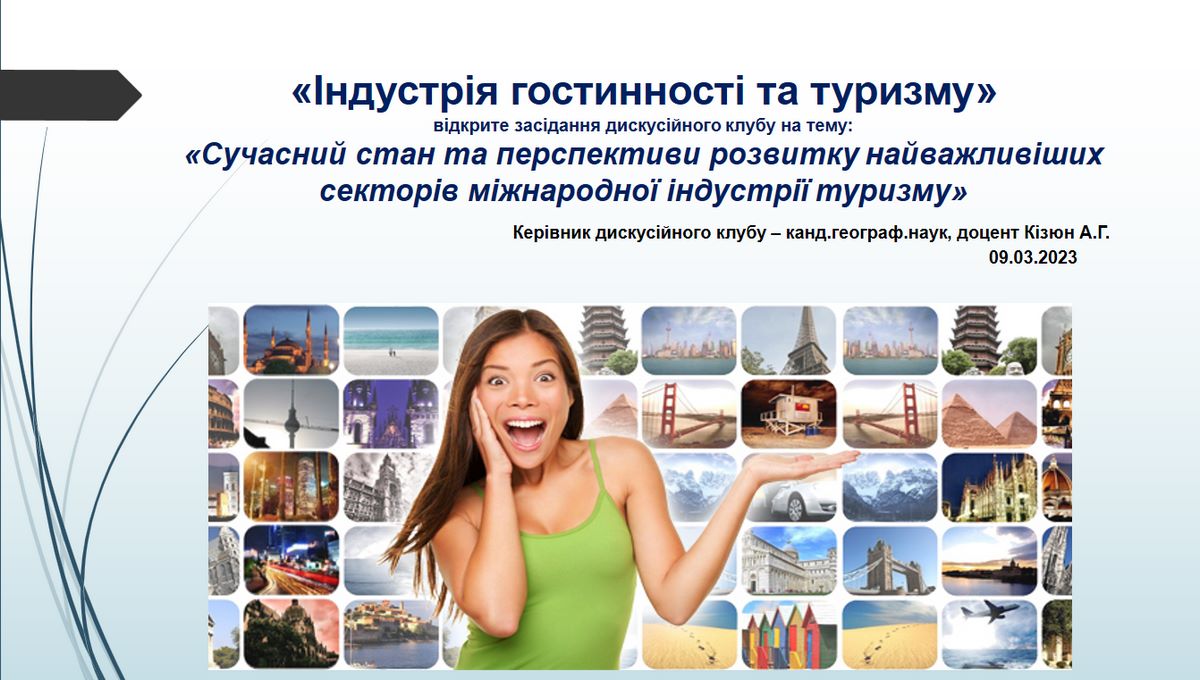 9 березня 2023 року у рамках XI Фестивалю студентської науки кафедрою туризму та готельно-ресторанної справи було проведено відкрите засідання дискусійного клубу «Індустрія гостинності та туризму» на тему «Сучасний стан та перспективи розвитку найважливіших секторів міжнародної індустрії туризму» (керівник клубу – Алла Кізюн, канд. географ. наук, доцент).