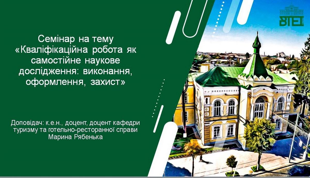 23 лютого 2023 року для здобувачів вищої освіти за спеціальностями 241 «Готельно-ресторанна справа» (освітня програма «Готельно-ресторанна справа») та 242 «Туризм» (освітня програма «Міжнародний туристичний бізнес») другого (магістерського) рівня вищої освіти денної та заочної форм навчання, Мариною Рябенькою, к.е.н., доцентом кафедри туризму та готельно-ресторанної справи, гарантом ОПП «Готельно-ресторанна справа» було проведено семінар на тему: «Кваліфікаційна робота як самостійне наукове дослідження». З вітальним словом виступила Наталія Чорна, д.і.н., професор, завідувач кафедри туризму та готельно-ресторанної справи, гарант ОПП «Міжнародний туристичний бізнес». Участь у науковому семінарі взяли також наукові керівники кваліфікаційних робіт.