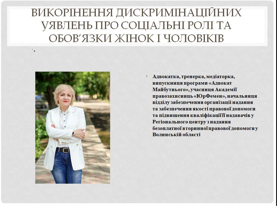 17 лютого 2023 року для студентів спеціальності «Право» та «Соціальне забезпечення», а також для викладачів ВТЕІ ДТЕУ проведено десятий із серії тренінг з запобігання домашньому насильству на тему «Викорінення дискримінаційних уявлень про соціальні ролі та обов’язки жінок і чоловіків», який провела Оксана Щесюк – адвокатка, тренерка, медіаторка, випускниця програми «Адвокат Майбутнього», учасниця Академії право захисниць «ЮрФемен», начальниця відділу забезпечення організації надання та забезпечення якості правової допомоги та підвищення кваліфікації її надавачів у Регіонального центу з надання безоплатної вторинної правової допомоги у Волинській області.