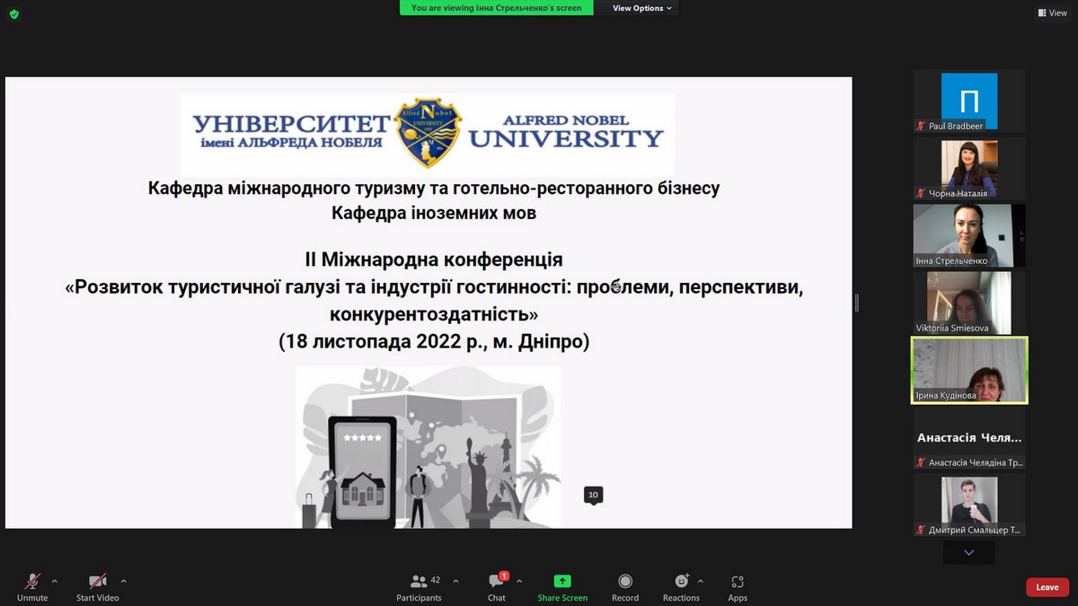18 листопада 2022 року науково-педагогічні працівники кафедри туризму та готельно-ресторанної справи, здобувачі вищої освіти за спеціальностями 241 «Готельно-ресторанна справа», 242 «Туризм» взяли участь у ІІ Міжнародній конференції «Розвиток туристичної галузі та індустрії гостинності: проблеми, перспективи, конкурентоздатність», організованій Університетом імені Альфреда Нобеля (м. Дніпро).