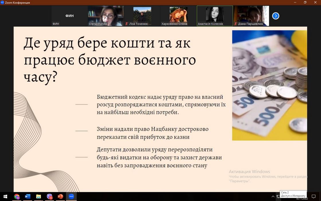 18 листопада 2022 року відбулося засідання студентського наукового гуртка «Актуальні проблеми модернізації фінансової системи» на тему «Публічні фінанси в умовах воєнного стану».