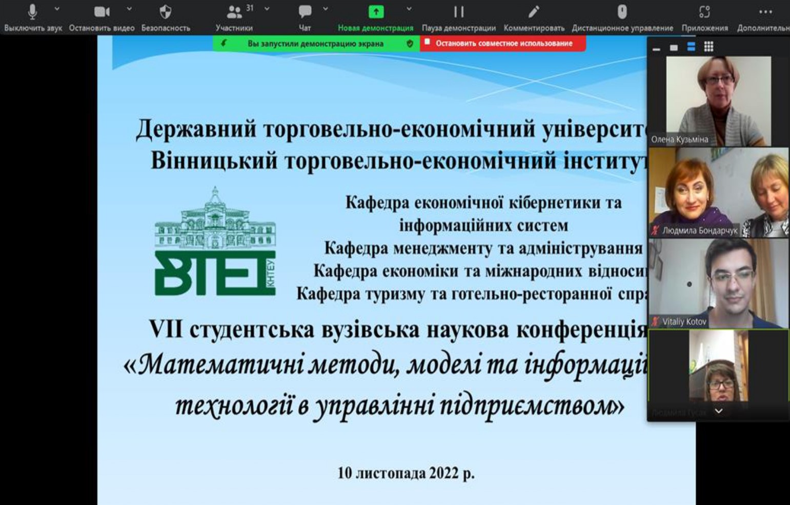 10 листопада 2022 року у рамках тижня факультету економіки, менеджменту та права відбулась VІІ студентська вузівська наукова конференція «Математичні методи, моделі та інформаційні технології в управлінні підприємством» в режимі онлайн на платформі ZOOM. Захід проводився кафедрою економічної кібернетики та інформаційних систем спільно з кафедрою менеджменту та адміністрування. У роботі конференції брали участь здобувачі вищої освіти ВТЕІ ДТЕУ. До уваги учасників конференції було запропоновано цікаві презентації доповідачів та відбулося активне обговорення доповідей.
