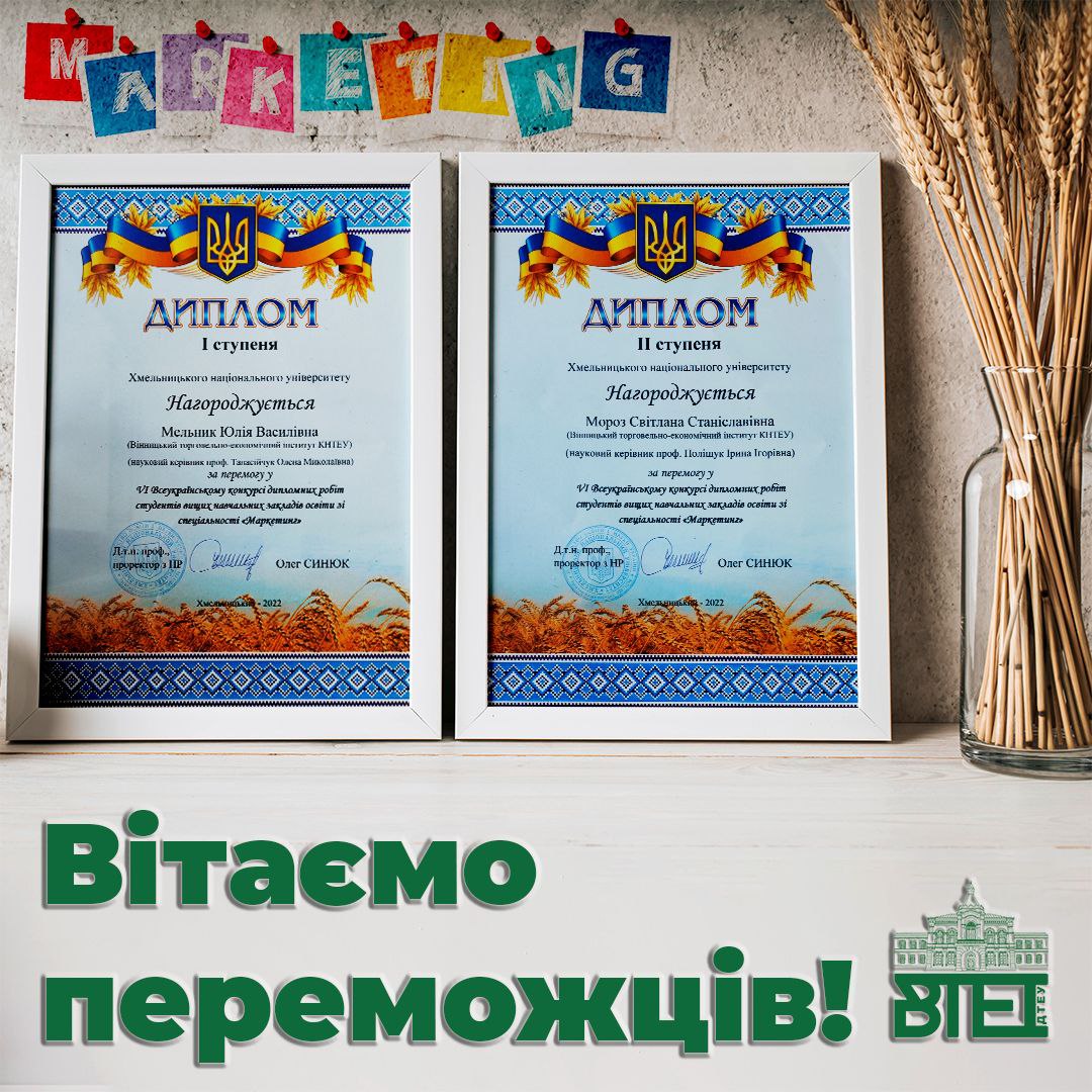 Кафедра маркетингу та реклами ВТЕІ ДТЕУ щиро вітає переможців VI Всеукраїнського конкурсу дипломних робіт студентів вищих навчальних закладів освіти зі спеціальності «Маркетинг». Журі конкурсу відзначило високий науковий рівень дипломних робіт магістрів-випускників ВТЕІ ДТЕУ спеціальності «Маркетинг». Дипломом І ступеня нагороджено Мельник Юлію (науковий керівник: д-р екон. наук, професор Альона Танасійчук) та дипломом ІІ ступеня нагороджено магістра ВТЕІ ДТЕУ Мороз Світлану (науковий керівник: д-р екон. наук, професор Ірина Поліщук).