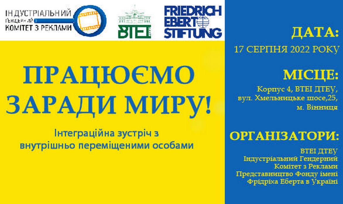 17 серпня 2022 року відбулася інтеграційна зустріч для внутрішньо переміщених осіб «ПРАЦЮЄМО ЗАРАДИ МИРУ!», організаторами якої стали Вінницький торговельно-економічний інститут ДТЕУ, Індустріальний Гендерний Комітет з Реклами в партнерстві з Представництвом Фонду імені Фрідріха Еберта в Україні.