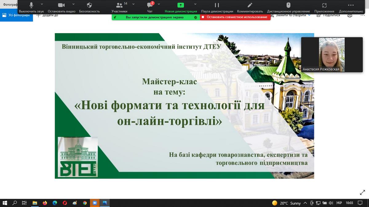 6 червня 2022 року випускниця ВТЕІ КНТЕУ 2018 року спеціальності «Підприємництво, торгівля та біржова діяльність» спеціалізації «Товарознавство та комерційна логістика» Рожковська Анастасія провела майстер-клас на тему «Нові формати та технології для офлайн-торгівлі» для здобувачів вищої освіти спеціальності «Підприємництво, торгівля та біржова діяльність» (ПТБД-11 д, ТКЛ-41д , ПТБД-11д(м)).